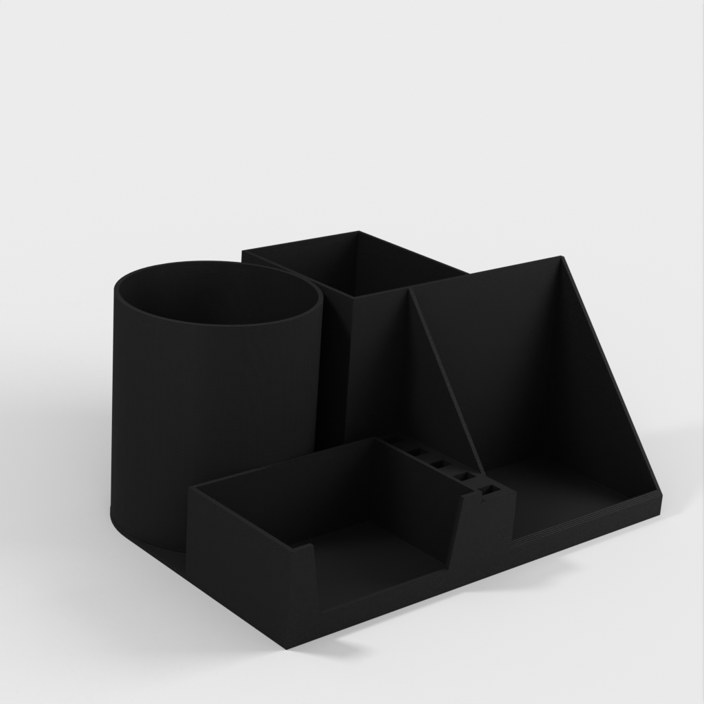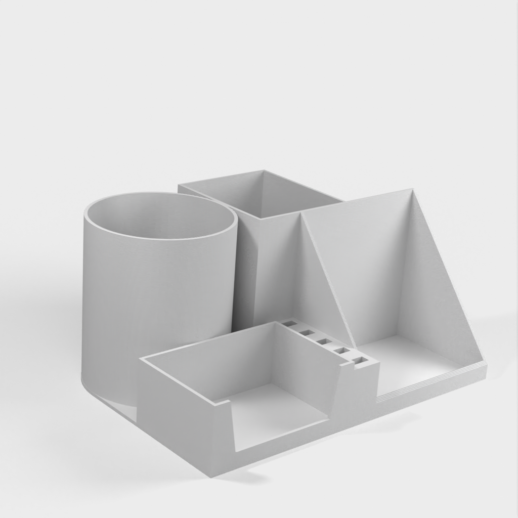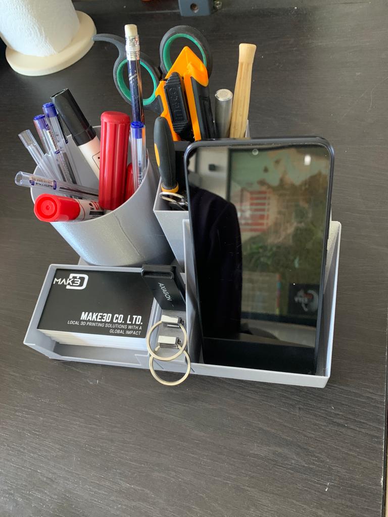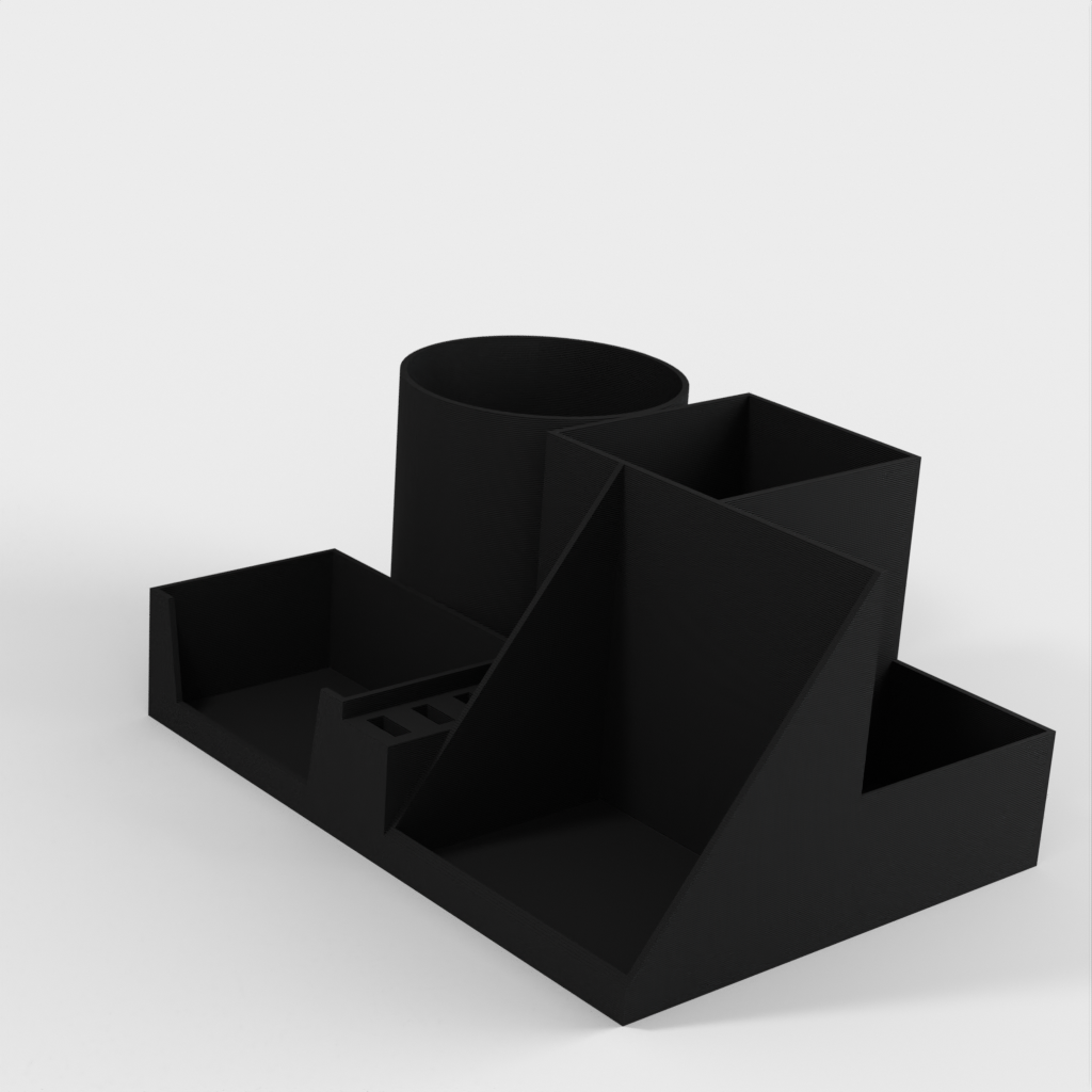 Detta är en 3D-skriven skrivbordsarrangör som fungerar som ett funktionellt verktyg utformat för att hålla en mobil, pennor, pennor eller markörer, underhållsverktyg, flash-enheter och visitkort. Håller ditt skrivbord organiserat och snyggt.