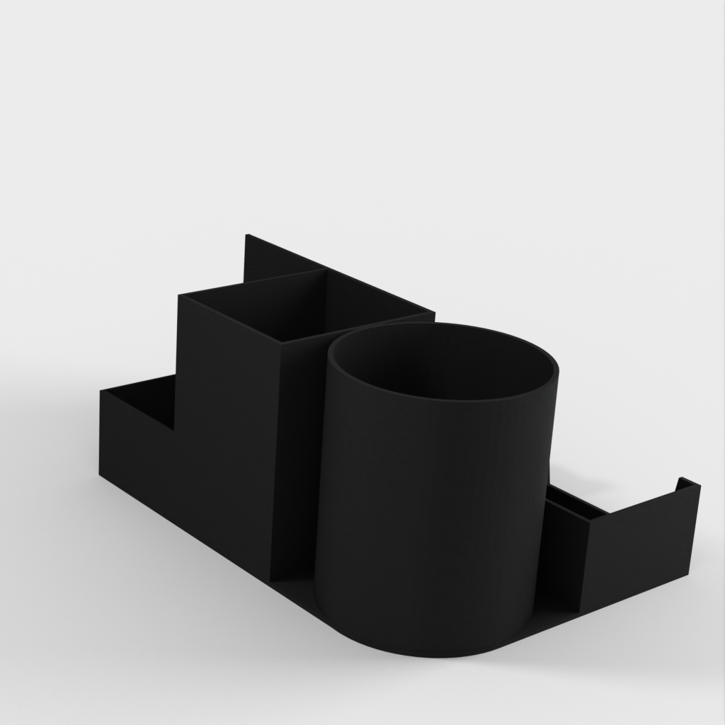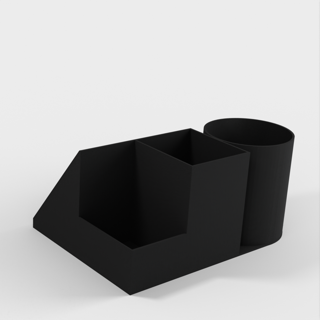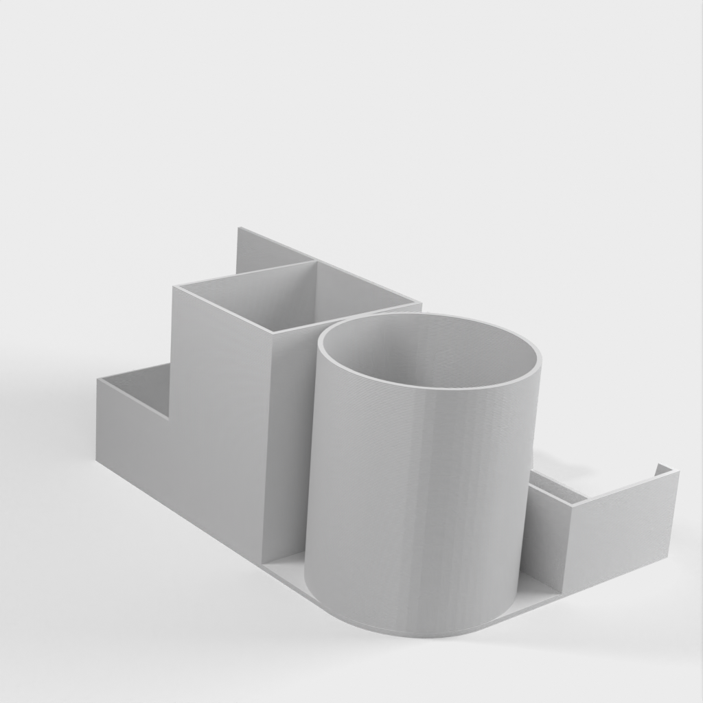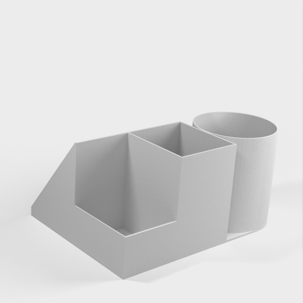 Detta är en 3D-skriven skrivbordsarrangör som fungerar som ett funktionellt verktyg utformat för att hålla en mobil, pennor, pennor eller markörer, underhållsverktyg, flash-enheter och visitkort. Håller ditt skrivbord organiserat och snyggt.