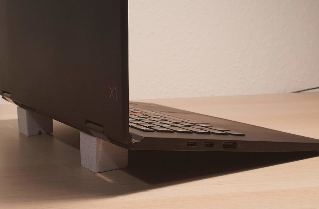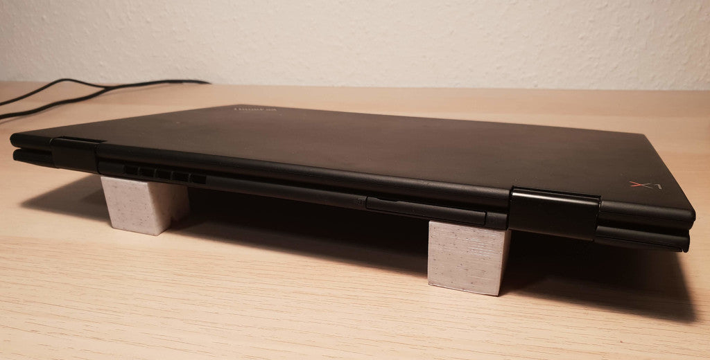 Detta är en enkel universell bärbar datorhållare som ger en vinkel på 10 grader för din bärbara dator. För de flesta bärbara datorer bör två av dessa vara tillräckligt för att ge bra stöd. Storleken är en kub med en sidolängd på 30 mm och höjden är tillräcklig för att vara ca 20 cm från början av din bärbara dator.