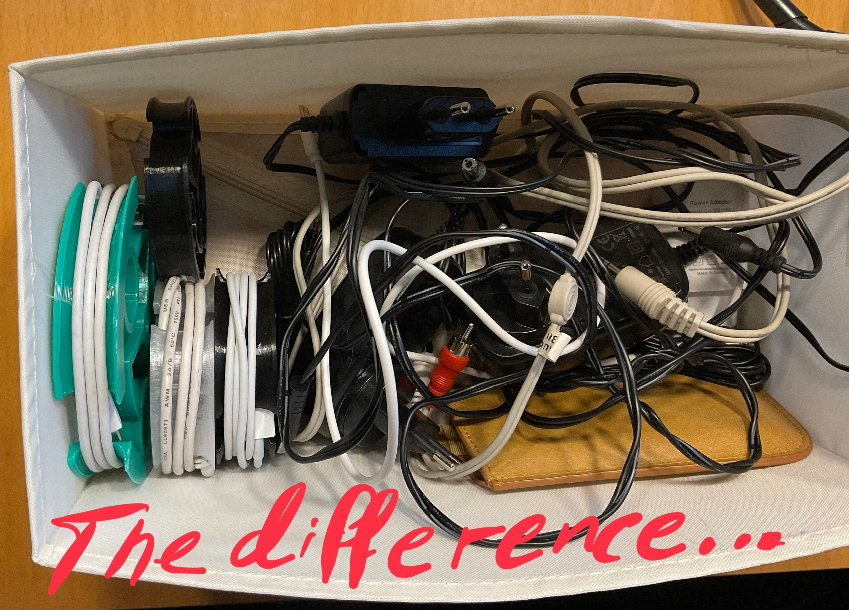 Organizern låter dig stapla många kablar bredvid eller ovanpå varandra som filmrullar i en låda. Denna metod förhindrar onödig stress på kablarna och ger en mer organiserad förvaringslösning. Arrangören kan även hängas på vid behov.
