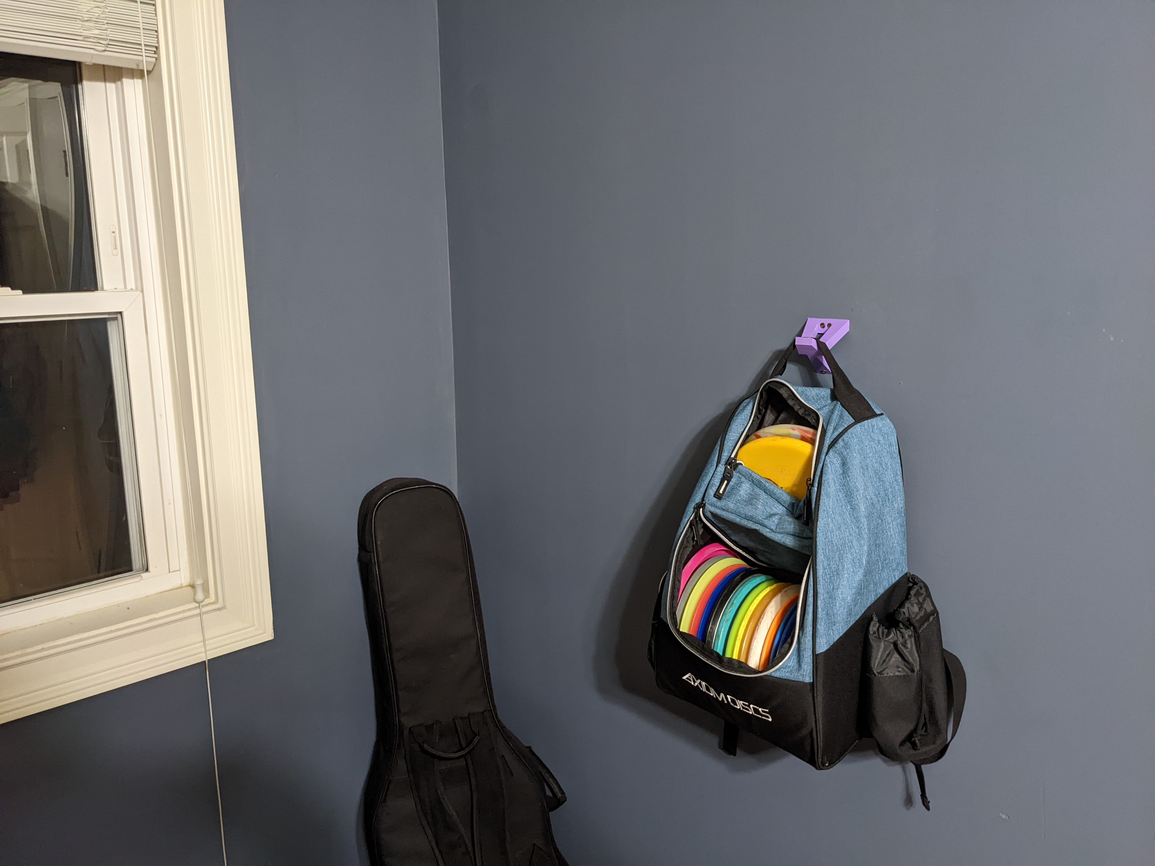 Detta är en väggkrok designad för att enkelt och effektivt hålla väskor, ryggsäckar eller andra föremål. Denna krok kan monteras på vilken vägg som helst med tre vanliga träskruvar. Den är idealisk för att organisera ditt utrymme och hålla saker inom räckhåll.