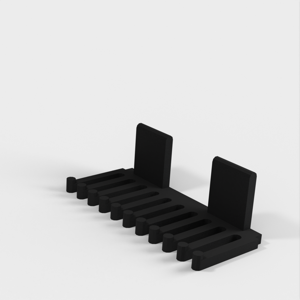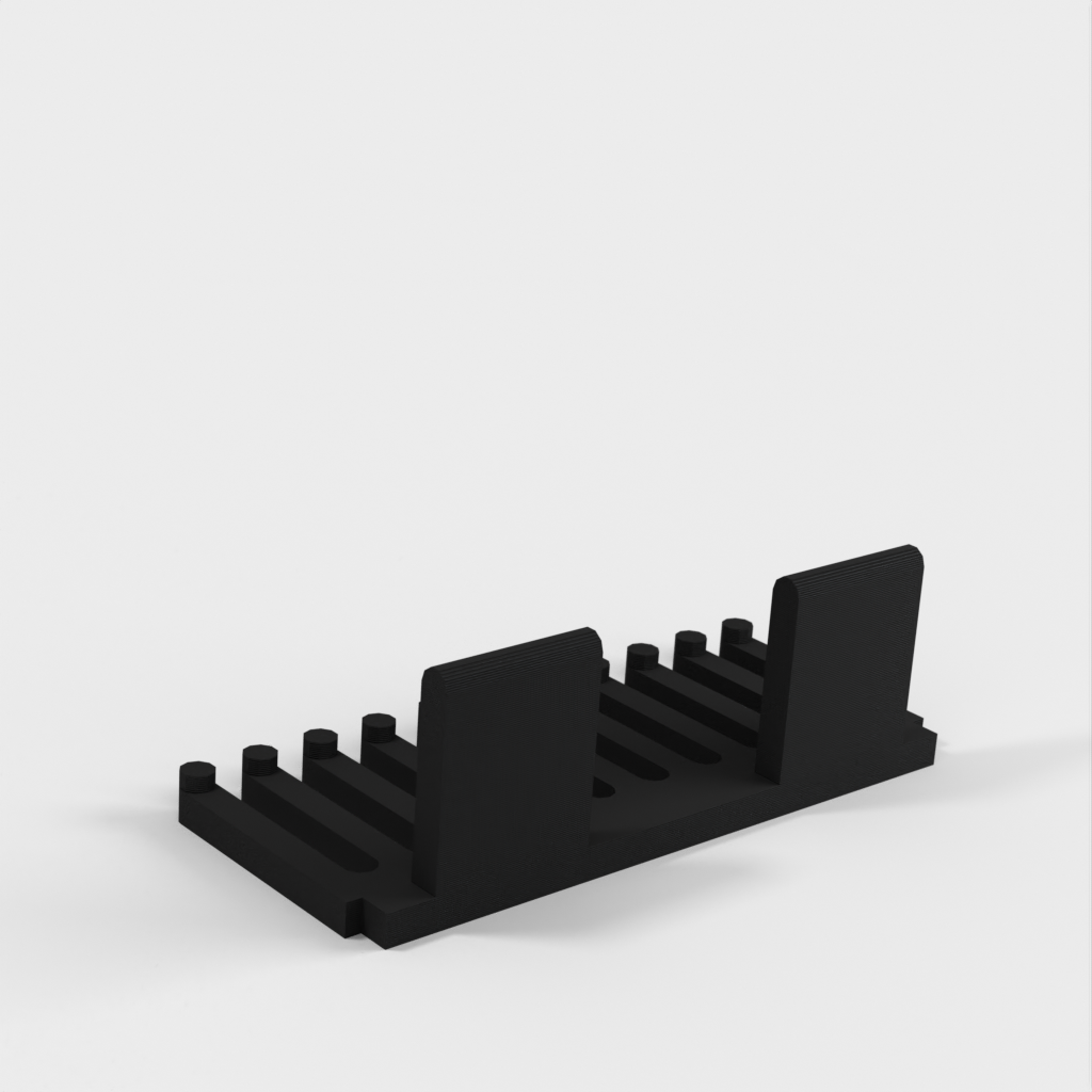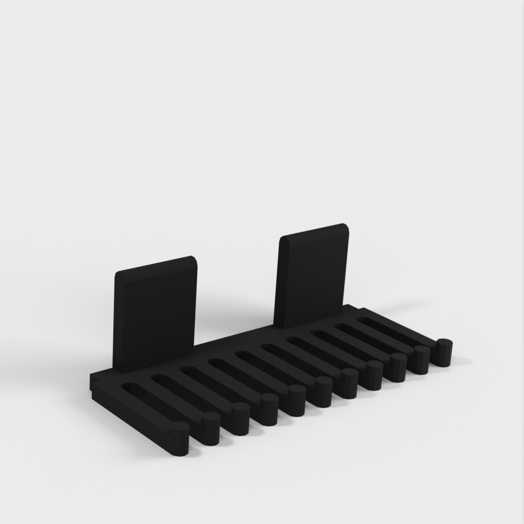 Kamblehandlers kabelhållare är ett praktiskt verktyg för att organisera och hålla dina kablar på plats. Denna kabelhållare har modifierats från den ursprungliga designen för att ha en plan yta. Detta tillåter användning av dubbelhäftande tejp eller 3M kontakthäftande remsor, beroende på dina preferenser och behov. Denna hållare är perfekt för alla hem, kontor eller verkstad för att hålla dina kablar snygga och snygga.