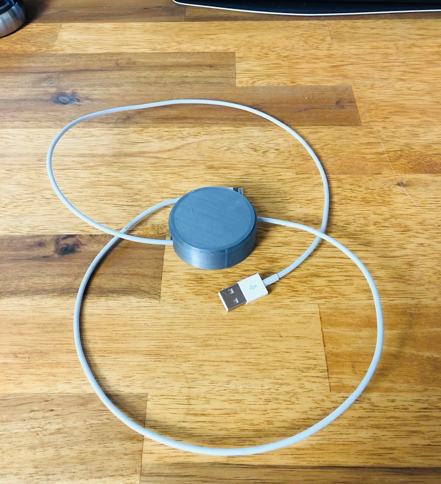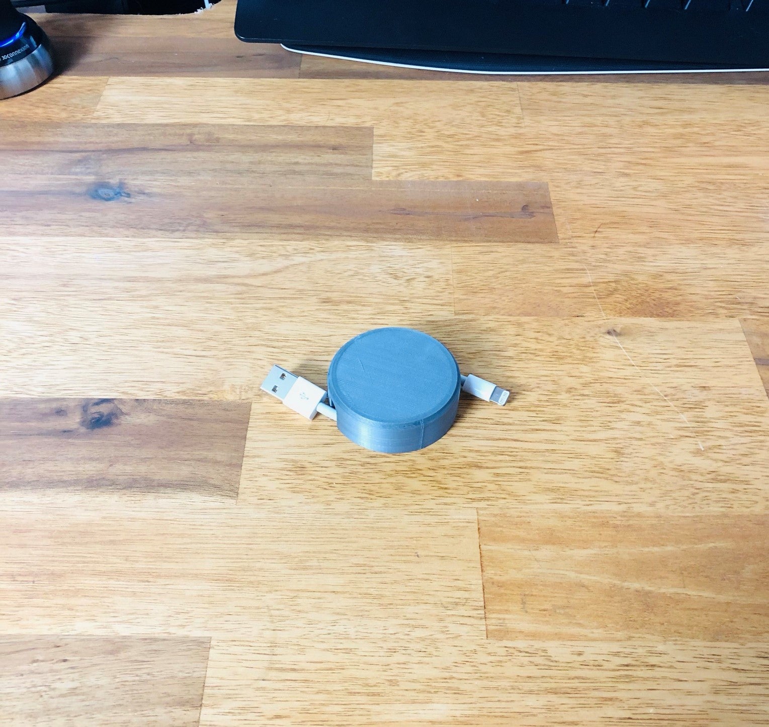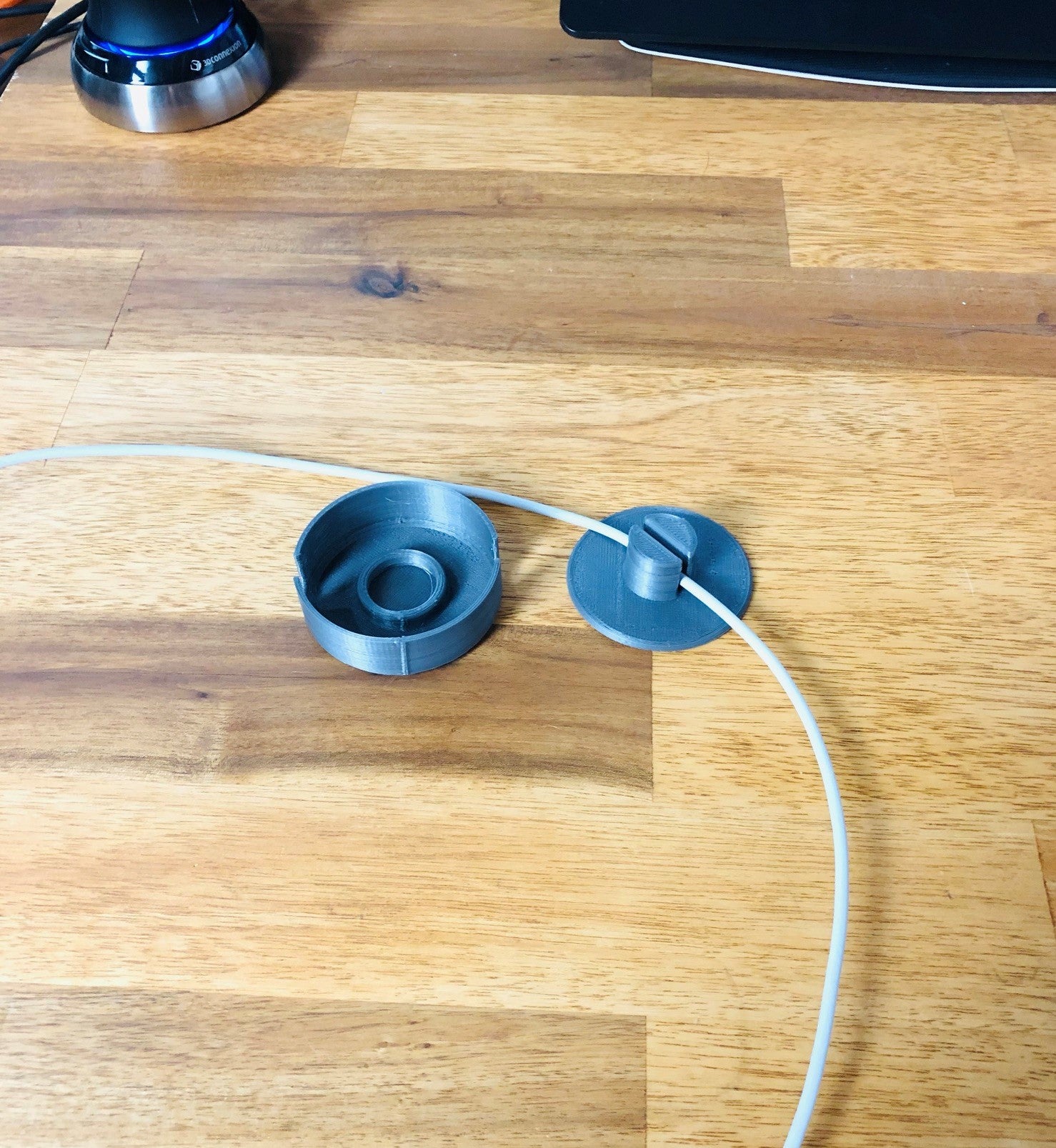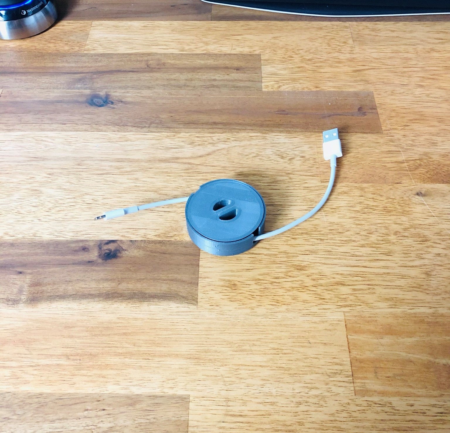 Detta är ett fodral för att lagra överflödiga kablar runt din arbetsstation eller så kan du använda det för att förvara dina hörlurar när du är på språng. Den har en enkel konstruktion som klickar ihop. Det finns ett spår på toppstycket som bottenstycket kommer att snäppa in i. Sätt in kabeln i spåret på bottenstycket, rikta in toppstycket med bottenstycket, tryck ihop dem tills de klickar ihop. Vrid bottenstycket med hjälp av fingerregistren på baksidan för att linda upp kabeln. Dra i kabeländarna för att förlänga kabeln.