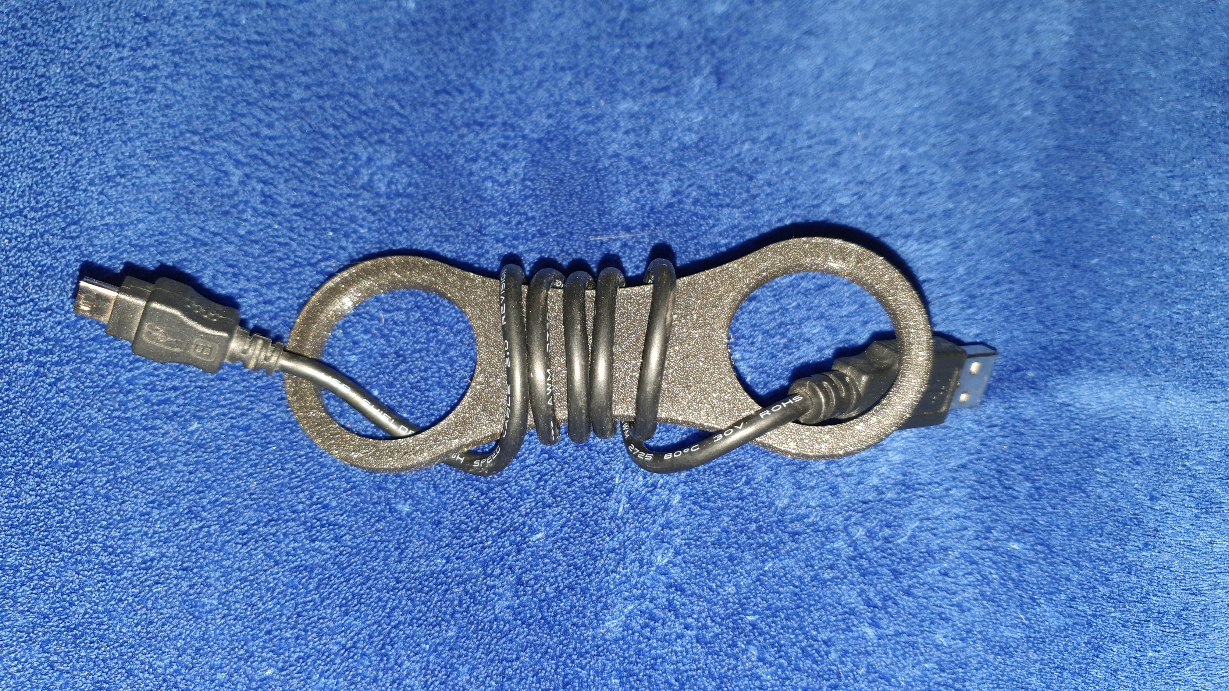 Detta är en kabelhållare som gör det enkelt för dig att organisera din röra av kablar. Placera helt enkelt ena änden av kabeln i ett hål, linda kabeln runt mitten och placera den andra änden av kabeln i det andra hålet. Det är en enkel och effektiv lösning för att skapa ordning i dina kablar.