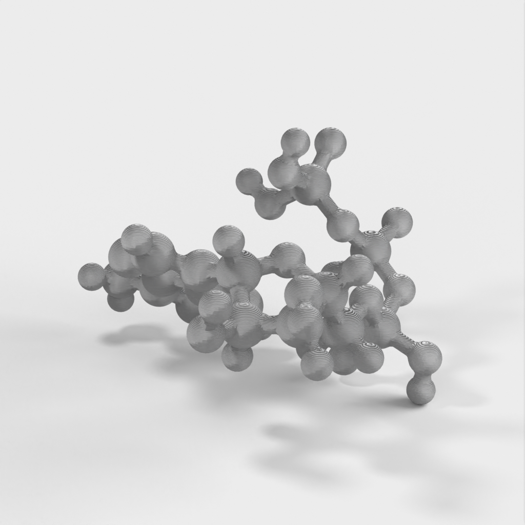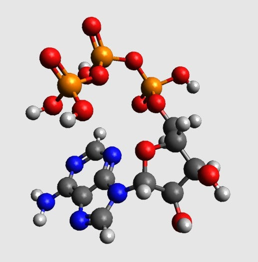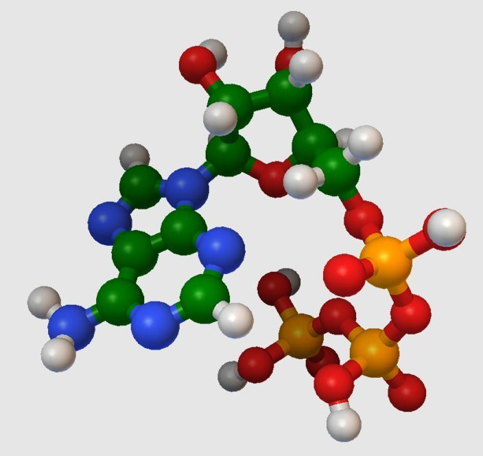 En molekylär modell av adenintrifosfat (ATP). Denna modell används för att lära ut kemi och är särskilt användbar för att förklara kroppens energileveranssystem. Modellen kan jämföras med en modell av ADP, som är ATP efter att ha tillhandahållit ett fosfat för energi. Modellen är vattentät och designad för att vara kompatibel med 3D-utskrift.