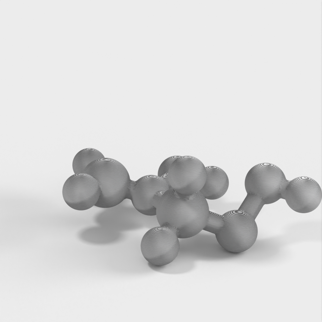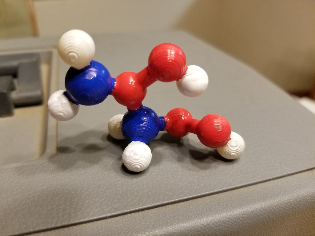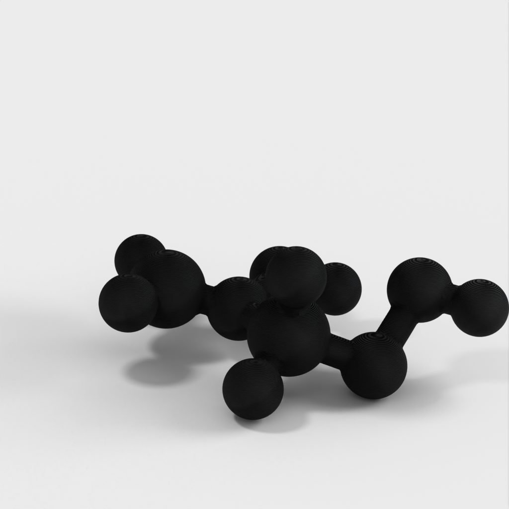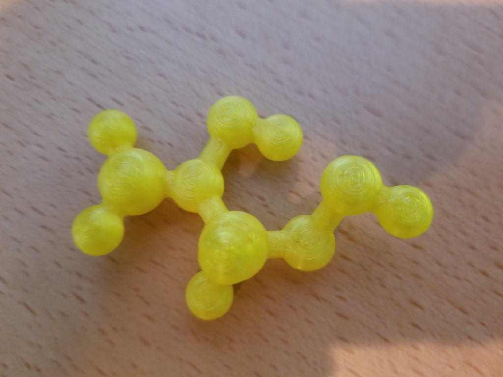 Detta är en molekylär modell av vinylacetat. Modellen används för att lära barn om kemi, speciellt polyvinylacetat (PVA), som är det vita lim som används för att göra slem i grundskolan. Denna modell ger en visuell bild av vad som finns i slem.