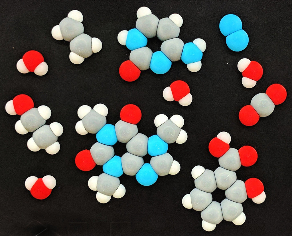 Utforska en värld av molekyler med vårt set för molekylmodeller för kylskåp. Detta kit erbjuder olika atomer som kan kombineras för att visa miljontals unika molekyler. Från enkla vätgaser till komplexa strukturer som DNA, du kan bilda och lära dig om olika kemiska föreningar direkt på din kylskåpsdörr. Setet innehåller också pilar för att presentera kemiska reaktioner och rekommenderade färger för varje atomtyp baserat på CPK-färgkoden. Obs: Satsen är en 2-dimensionell representation och kan därför inte exakt visa vissa 3-dimensionella molekyler.