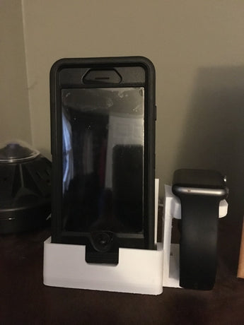 Denna praktiska laddningsstation är utformad för att ge en organiserad lösning för din iPhone 6 och Apple Watch. Den passar specifikt en iPhone 6, även när den är utrustad med ett robust Otterbox-skal, samtidigt som den erbjuder ett dedikerat utrymme för din Apple Watch.