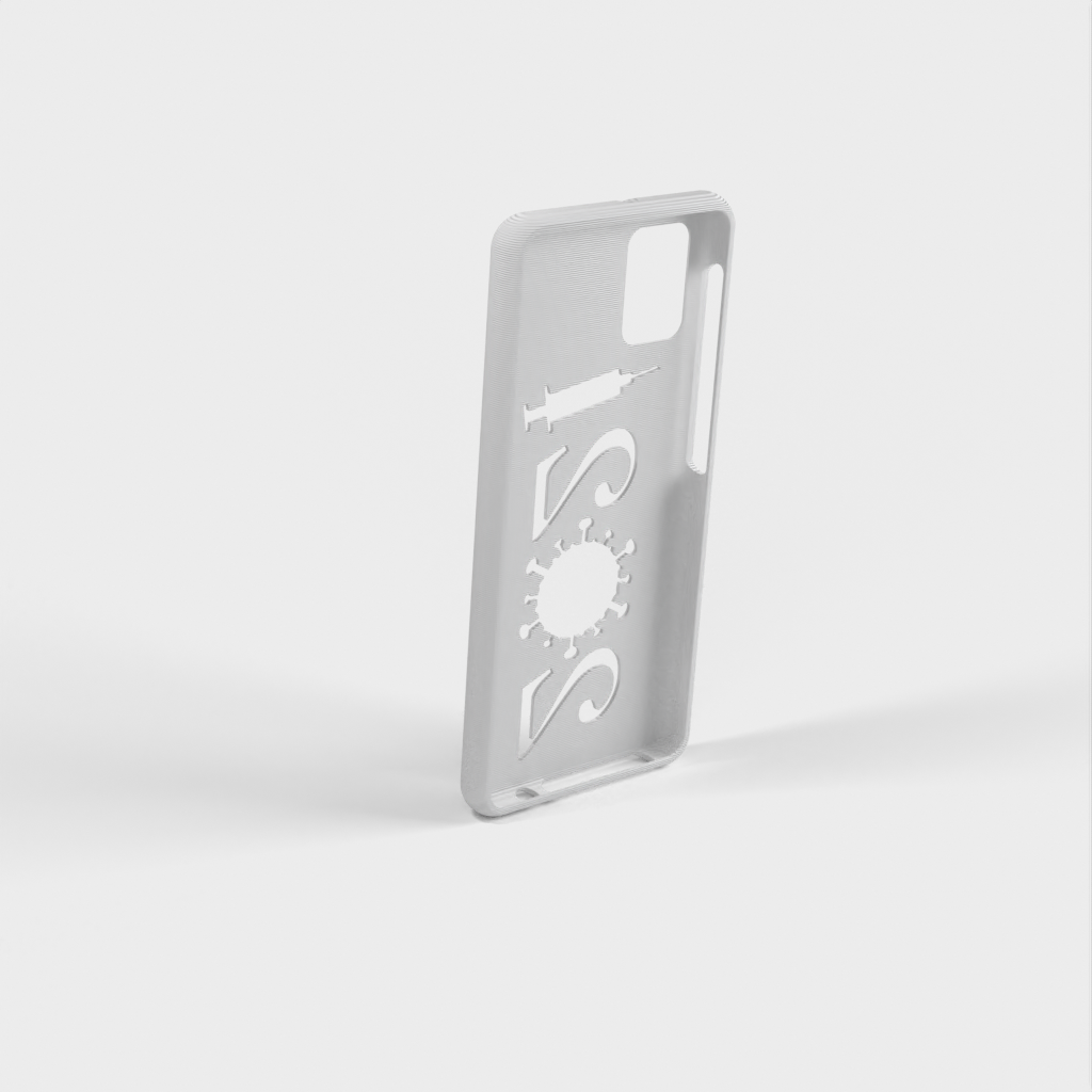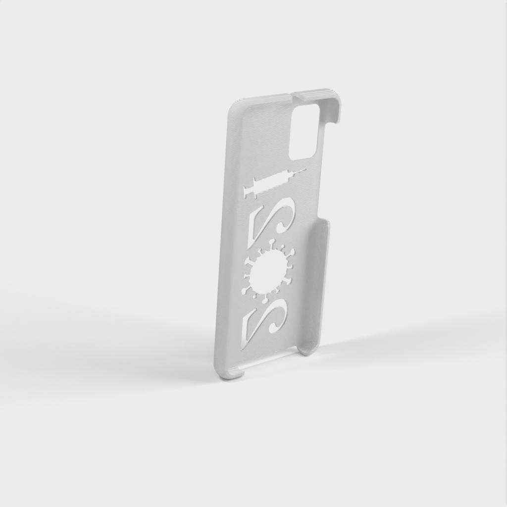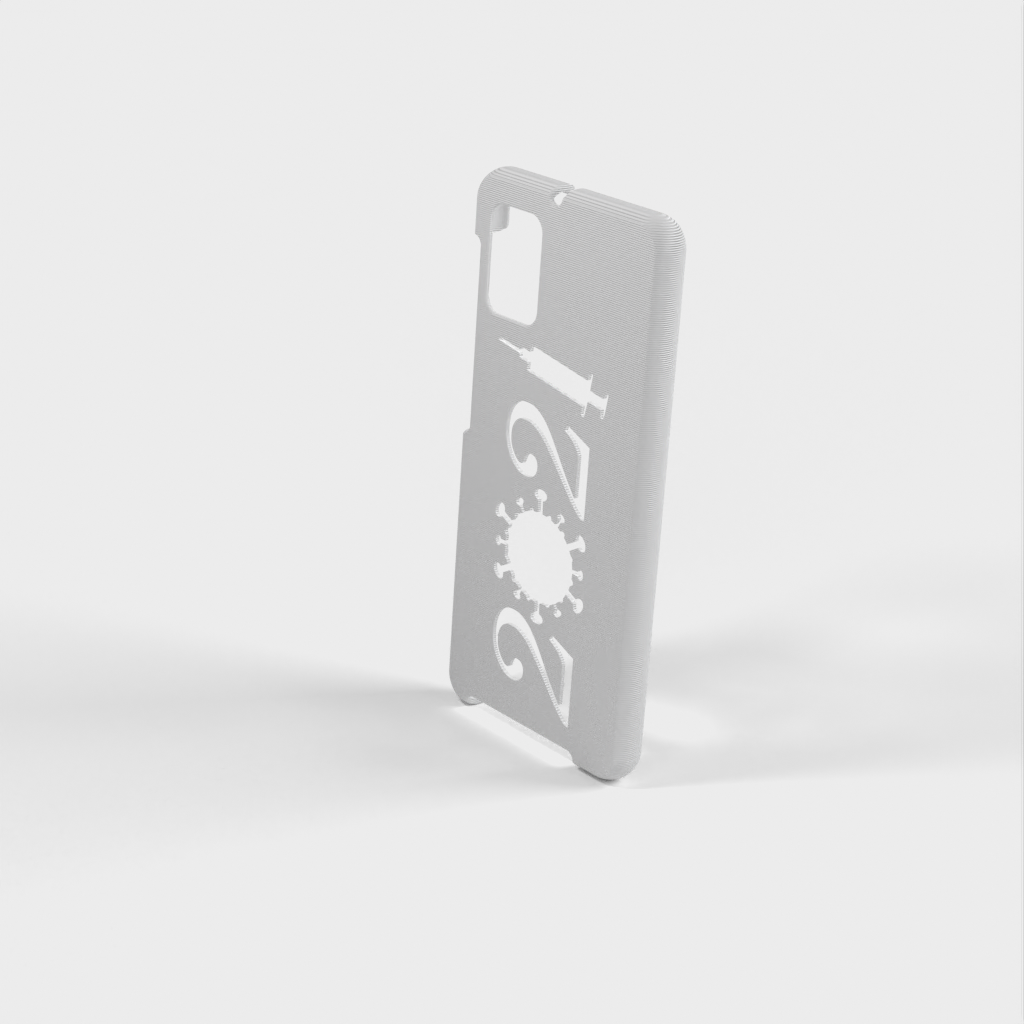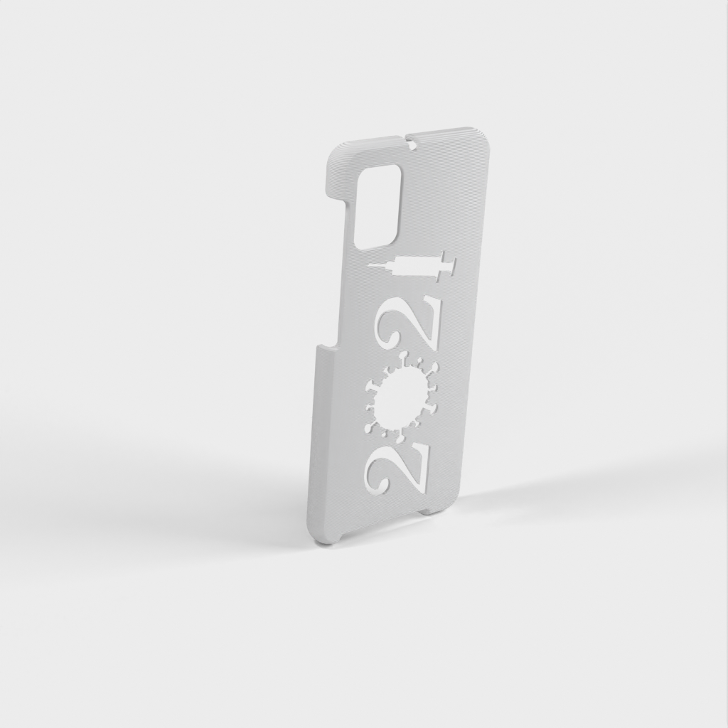 Ett mobilfodral för Samsung Galaxy A31 a315. Skalet är designat för att passa perfekt runt telefonen, och det finns öppningar för alla knappar och funktioner. På baksidan av fodralet finns en unik design med årtalet "2021" format som ett virus och en spruta - en symbol för covid-19-vaccinationen.
