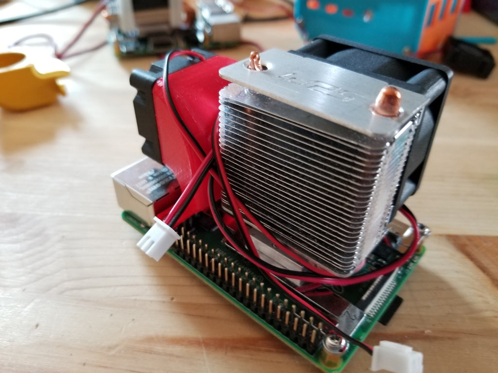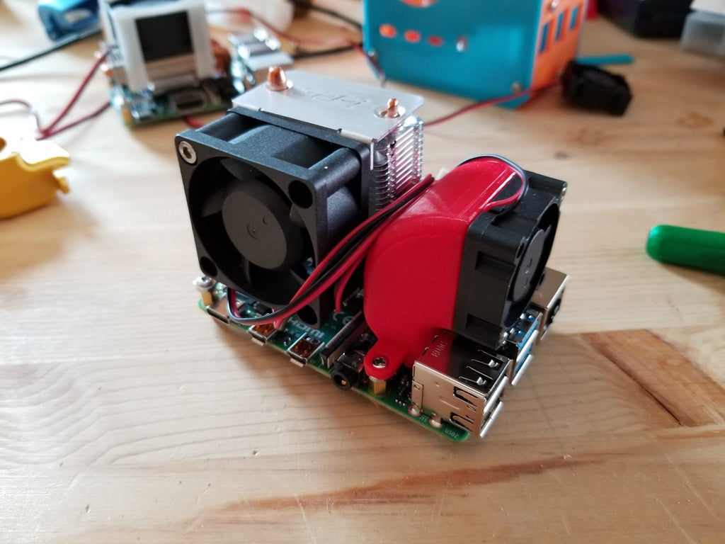Tanken med den sekundära fläkten är att blåsa luft mellan botten av Ice Tower-kylflänsen och Pi:s PCB, kyla de andra delarna på PCB:n och ytterligare kyla kylflänsen genom att blåsa luft förbi värmerören.