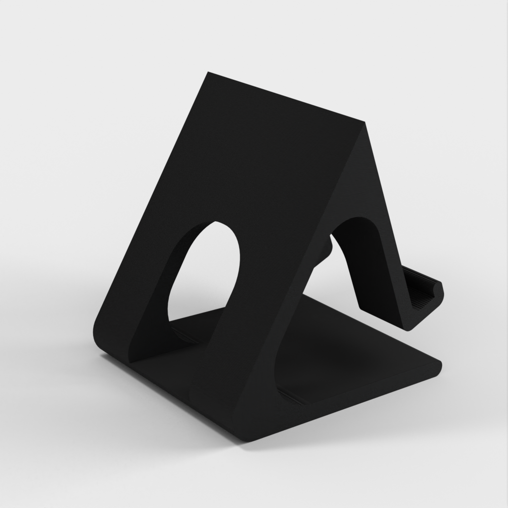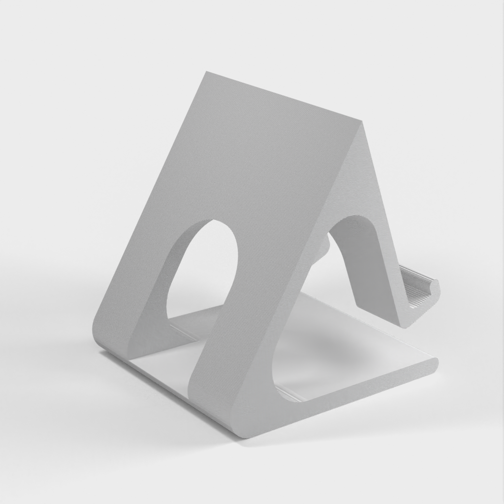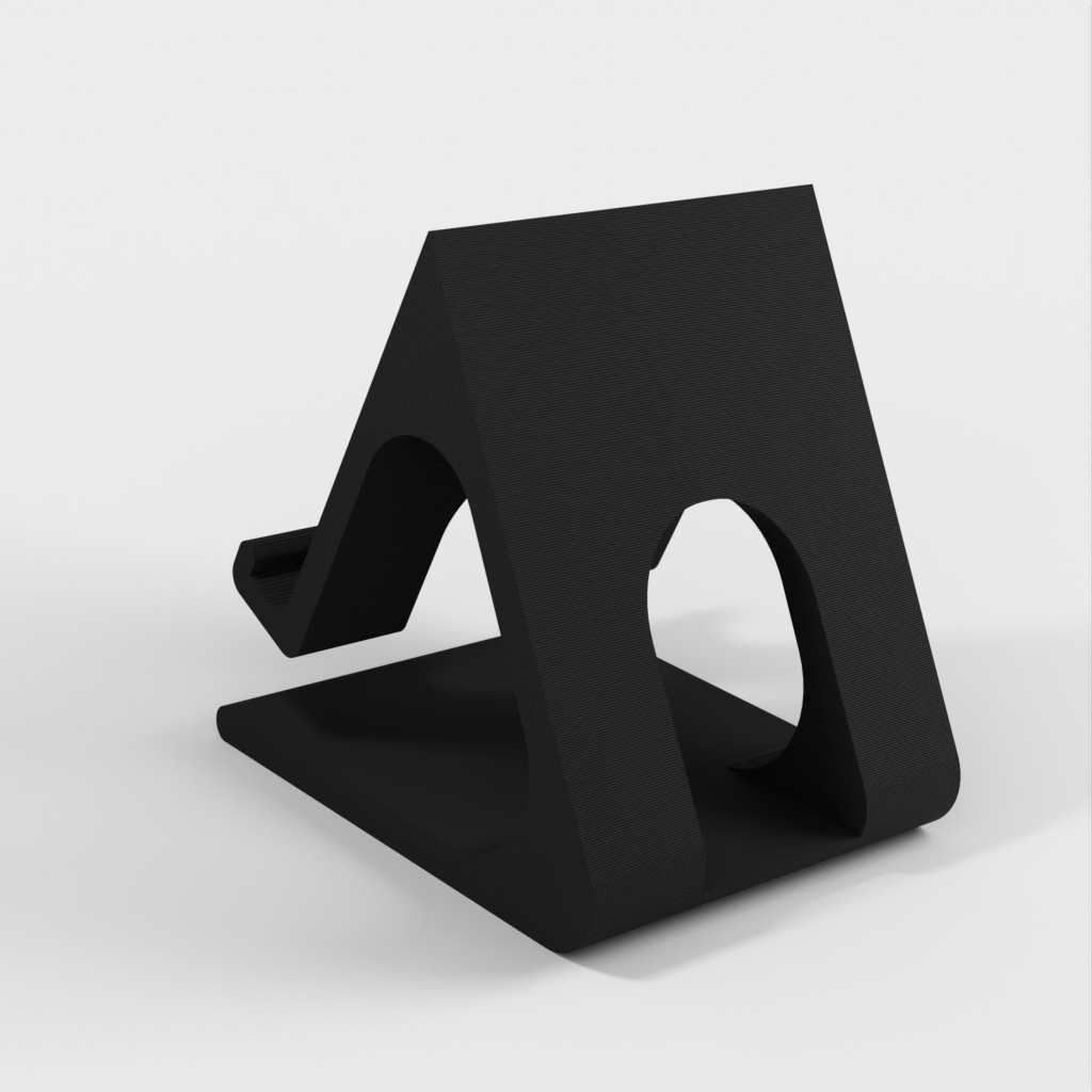 Enkelt telefonställ för en iPhone 6 som även kan passa andra modeller. Kabeln går genom hålet så att den är redo att användas. Detta telefonställ är idealiskt för skrivbordet eller kontoret och kan enkelt anpassas för att passa dina behov.