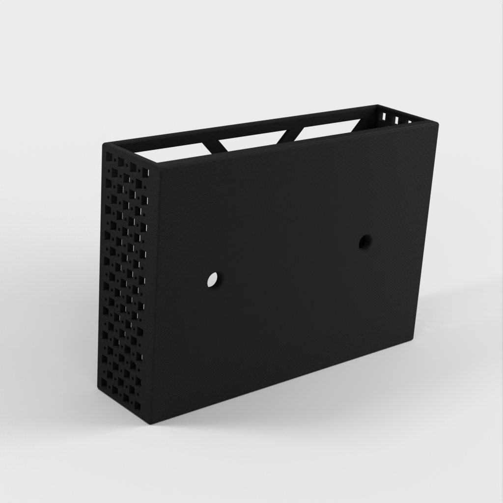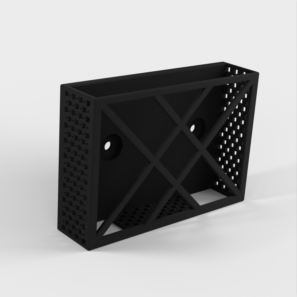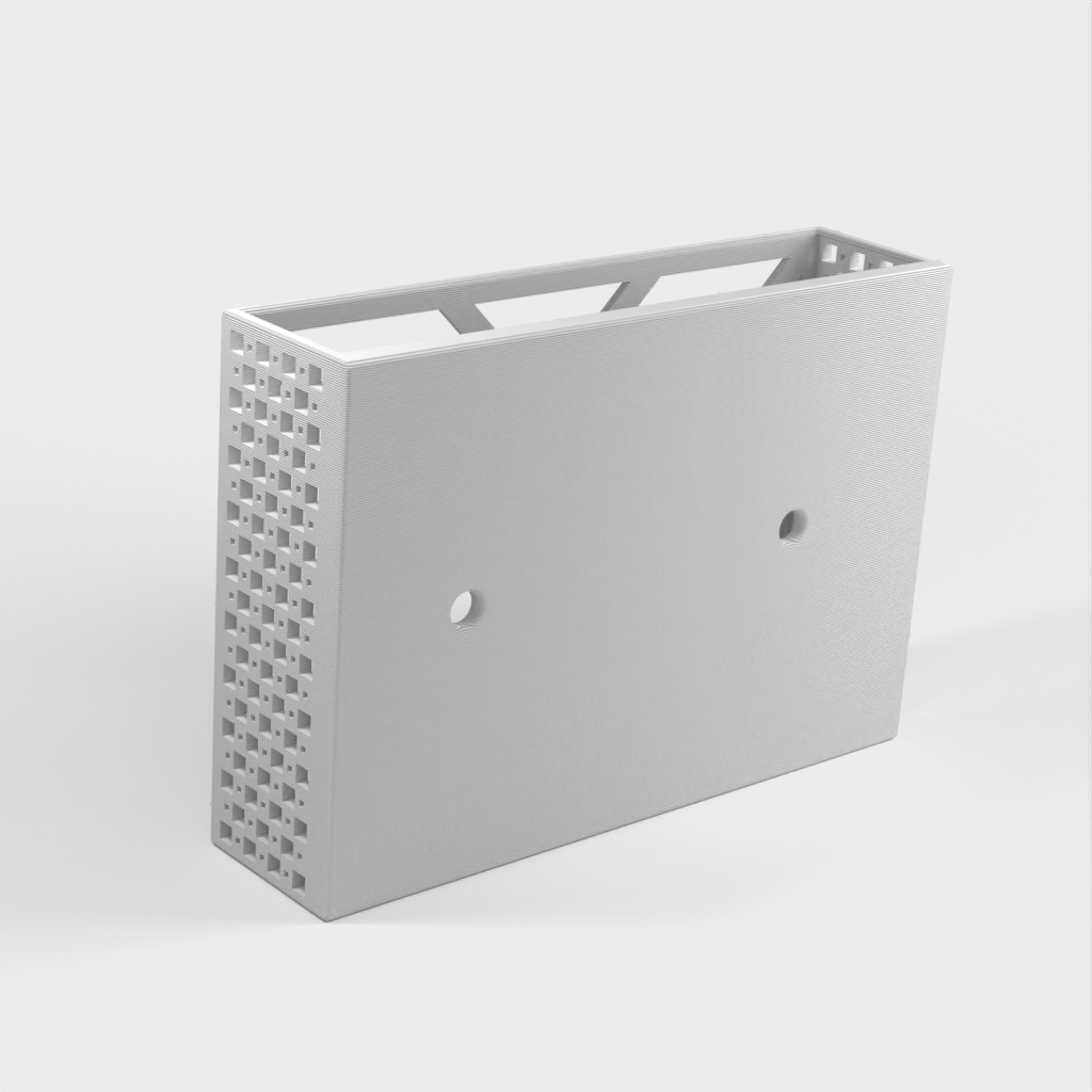 Ett väggfäste skapat specifikt för Ubiquiti EdgeRouter X är designat för att använda POE på eth0. Hålen i sidorna ger luftcirkulation och förhindrar överhettning. Extra rattar ingår för att hjälpa till att hålla EdgeRouter X på plats, samt hål på baksidan för ström, jord och återställningsåtkomst. Kanterna är skurna och fyllda för bättre hantering och snyggare utseende.