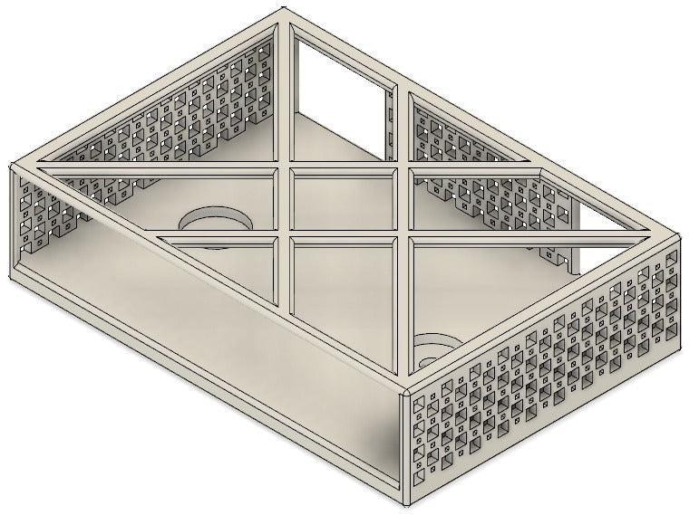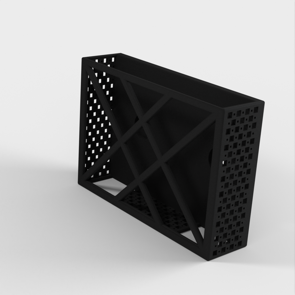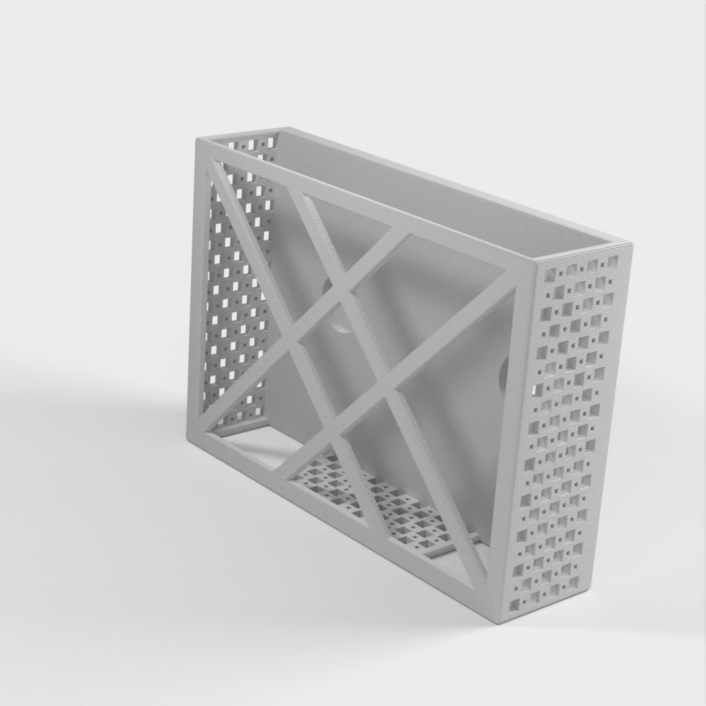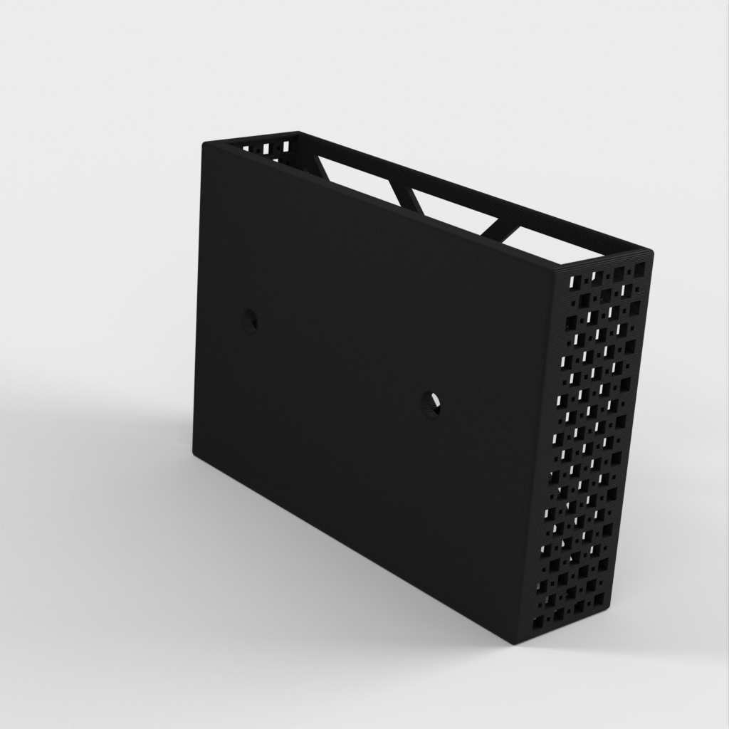 Ett väggfäste skapat specifikt för Ubiquiti EdgeRouter X är designat för att använda POE på eth0. Hålen i sidorna ger luftcirkulation och förhindrar överhettning. Extra rattar ingår för att hjälpa till att hålla EdgeRouter X på plats, samt hål på baksidan för ström, jord och återställningsåtkomst. Kanterna är skurna och fyllda för bättre hantering och snyggare utseende.