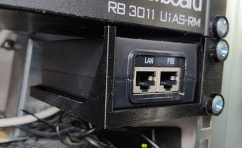 PoE-väggadaptern kan monteras med två M3-skruvar, varefter du kan fästa adaptern ovanpå den. Spegla den om du vill montera den på vänster sida av ditt rack.
