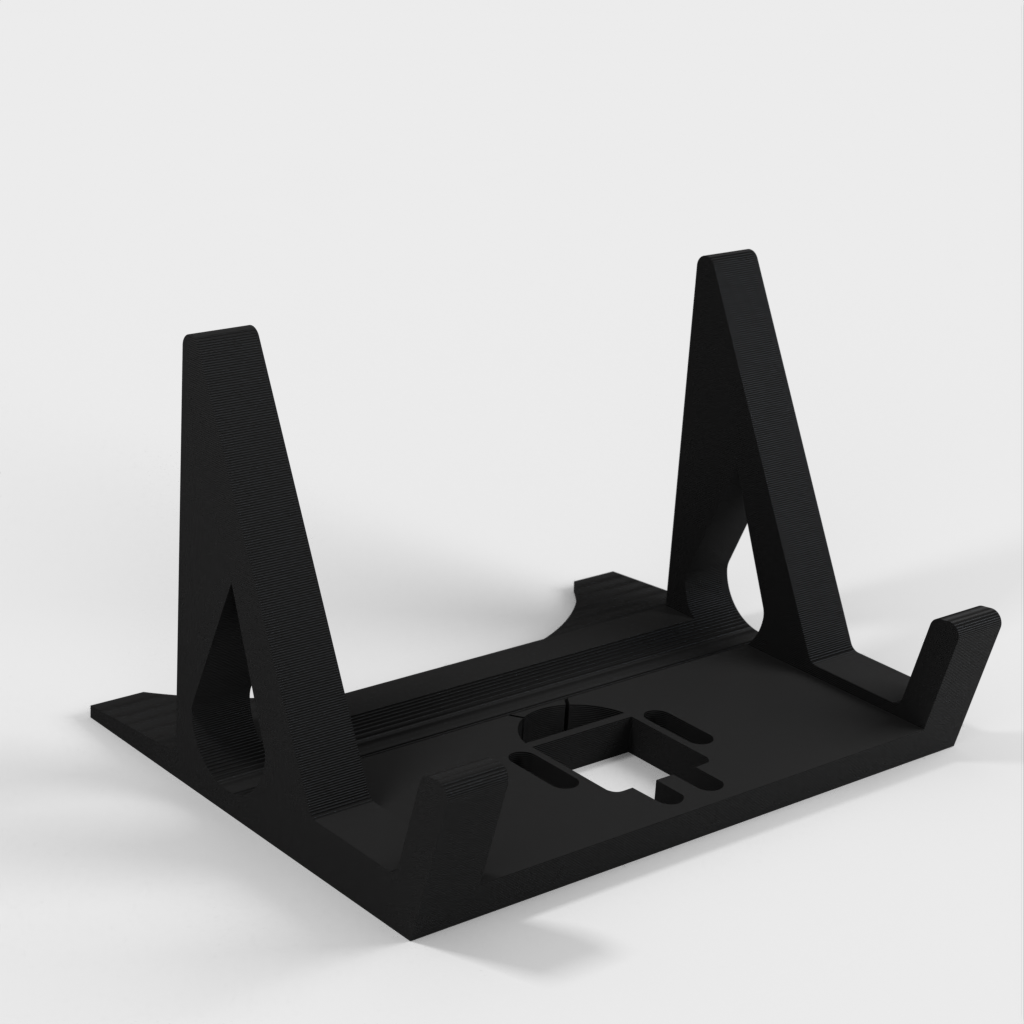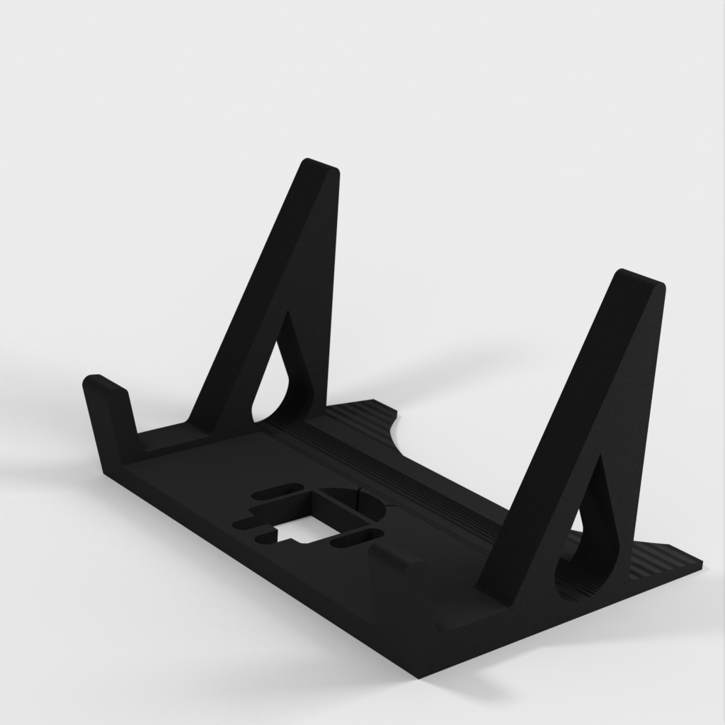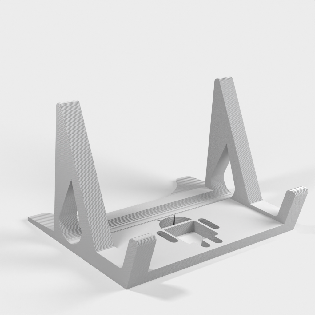 Universal Android-mobiltelefonstativ - lämplig för både vertikal och horisontell placering av din telefon. Ny version med utökad bas för att förhindra att den faller med telefoner större än 3,5" (testad med 4" och 4,5" telefoner). Den har även en skena i full bredd för bättre säkerhet mot att telefoner glider mellan. En modell för en 10" surfplatta är nu tillgänglig.