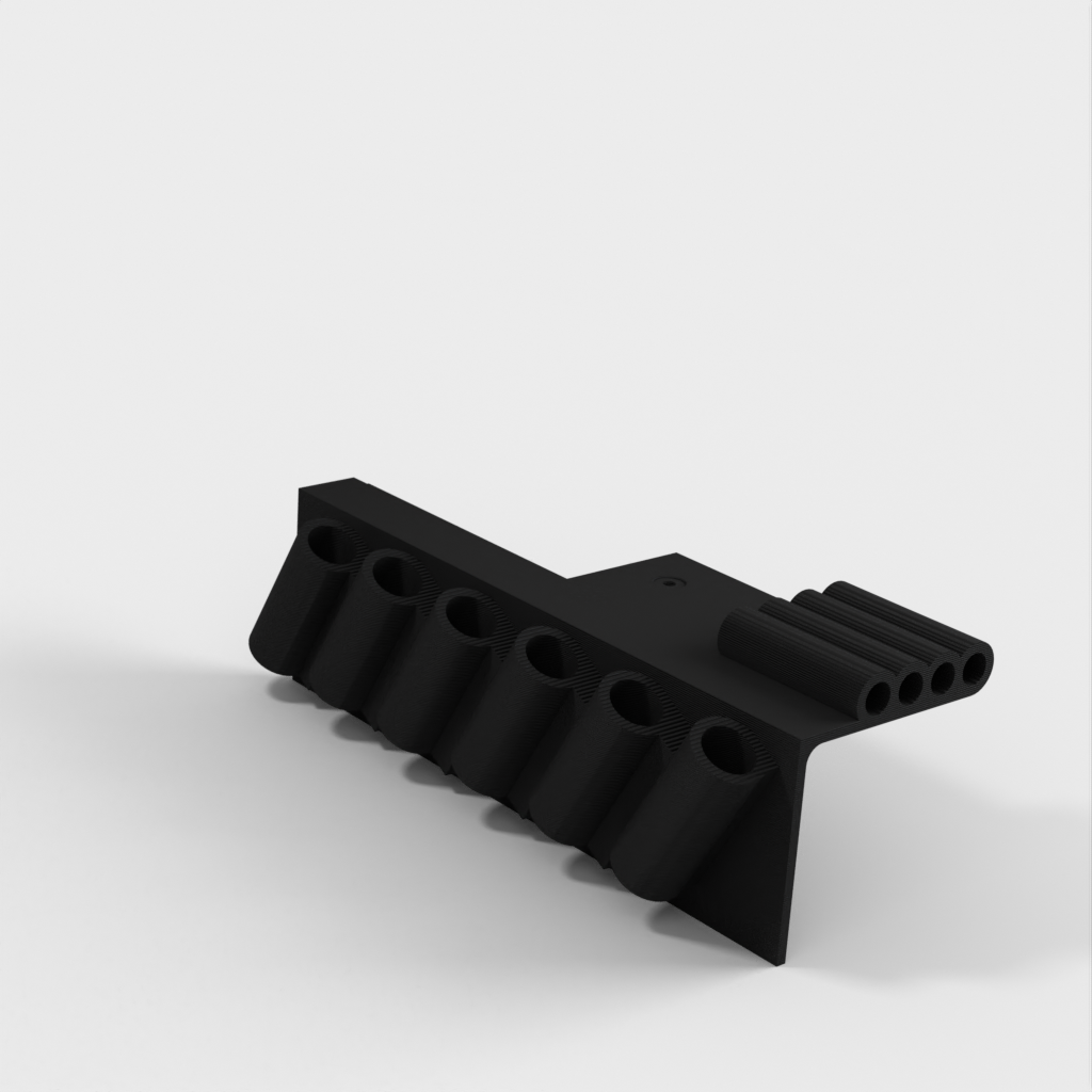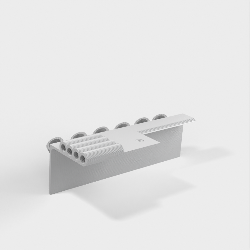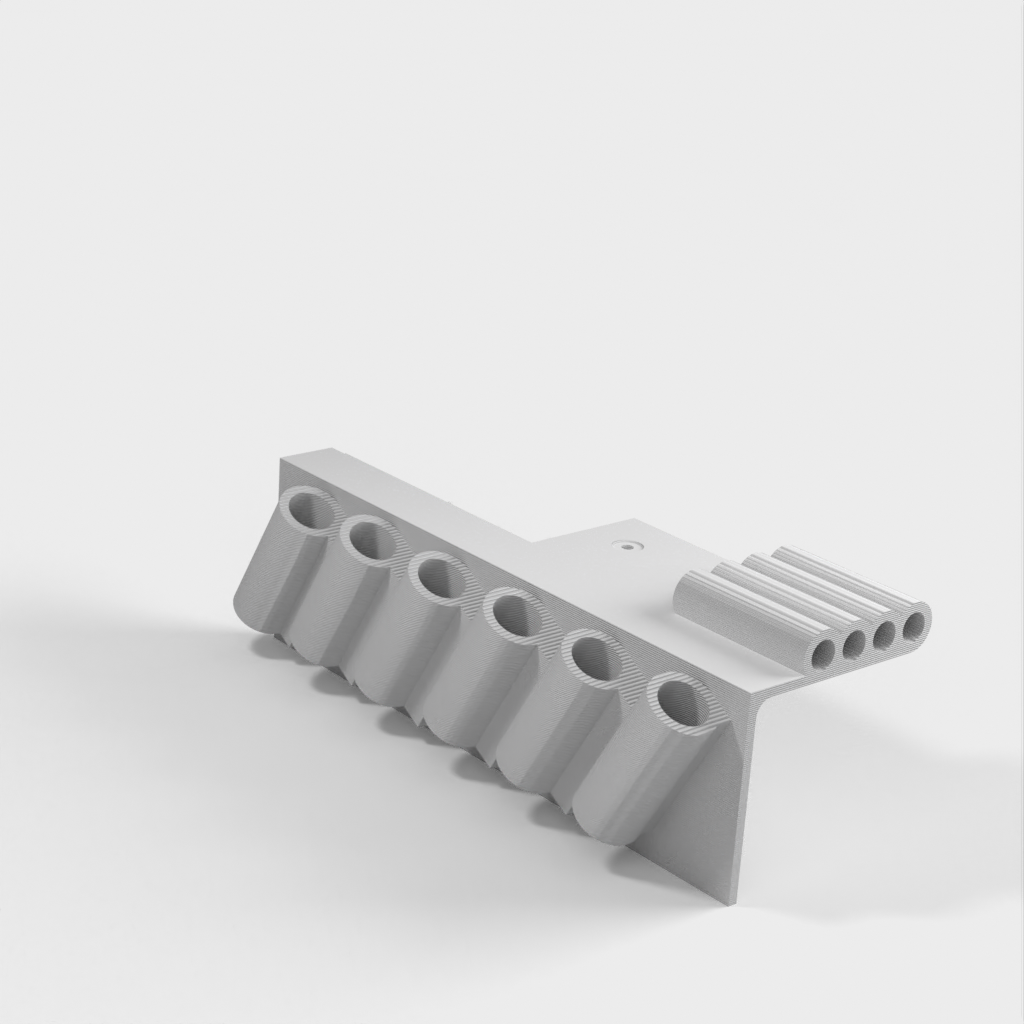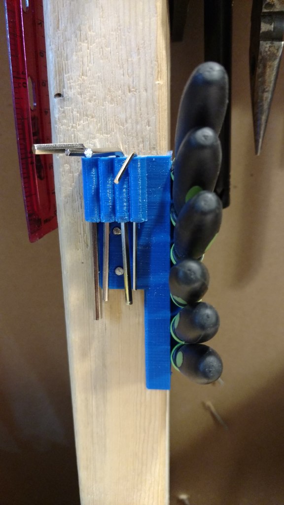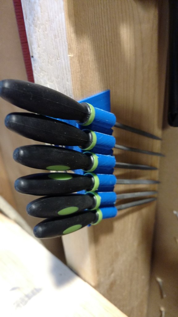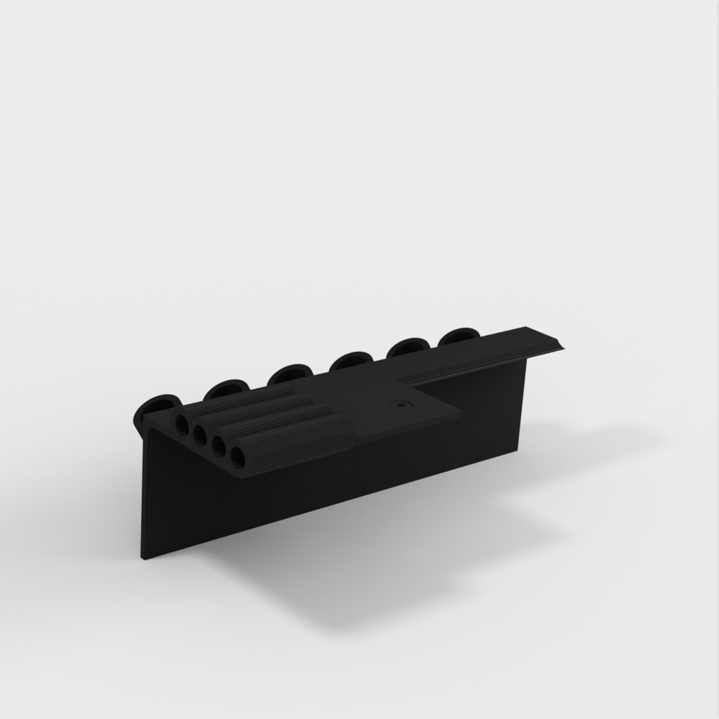 Dubbfäste verktygshållare designad för 6-delad nålfil (som dessa: http://a.co/iLnJ8kb ) eller liknande verktyg samt 4 insexnycklar/nyckel, som de som levereras med Anet A8 3D-skrivaren . Sex spår är vinklade och åtskilda för att förhindra att verktygshandtagen kolliderar. Två försänkta spikhål för montering på väggregel.
