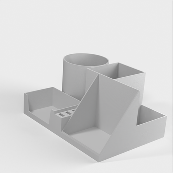 Detta är en 3D-skriven skrivbordsarrangör som fungerar som ett funktionellt verktyg utformat för att hålla en mobil, pennor, pennor eller markörer, underhållsverktyg, flash-enheter och visitkort. Håller ditt skrivbord organiserat och snyggt.