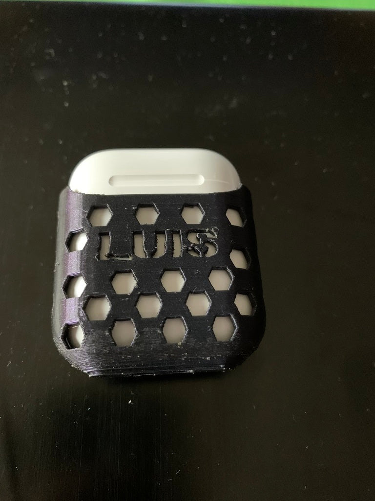 Ett Airpods v2 hexagonfodral. Det finns två versioner av filen, med och utan en plats för att infoga ditt namn.