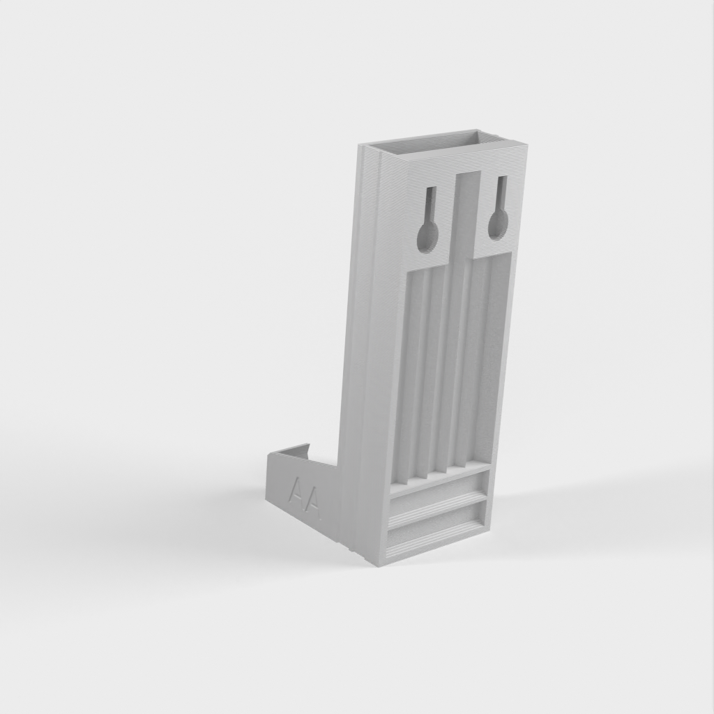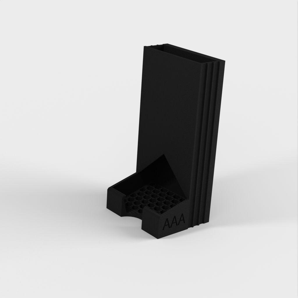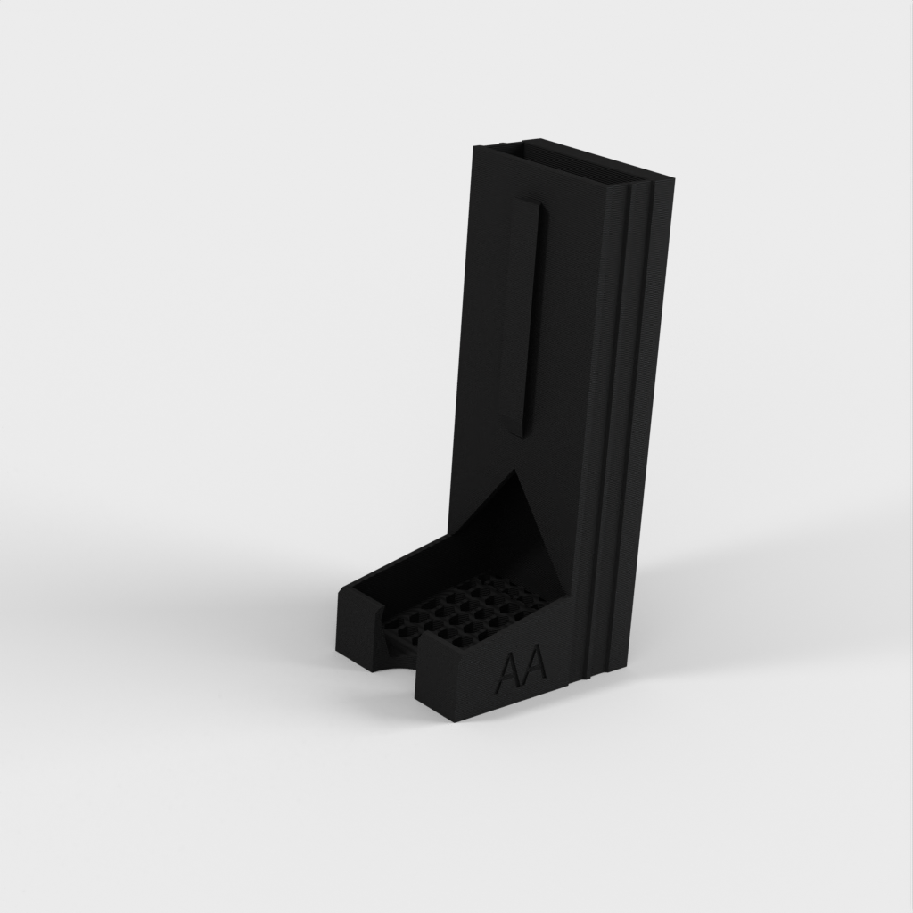 Batterihållare för AA- och AAA-batterier. Hållare kan monteras och ett väggfäste finns. Det är ett praktiskt och rymligt system för att förvara dina batterier och håller ditt område organiserat och snyggt.