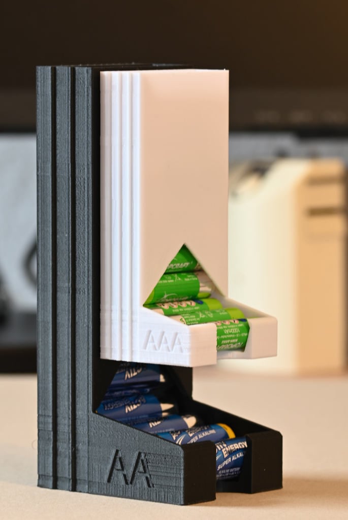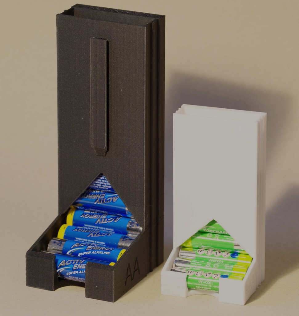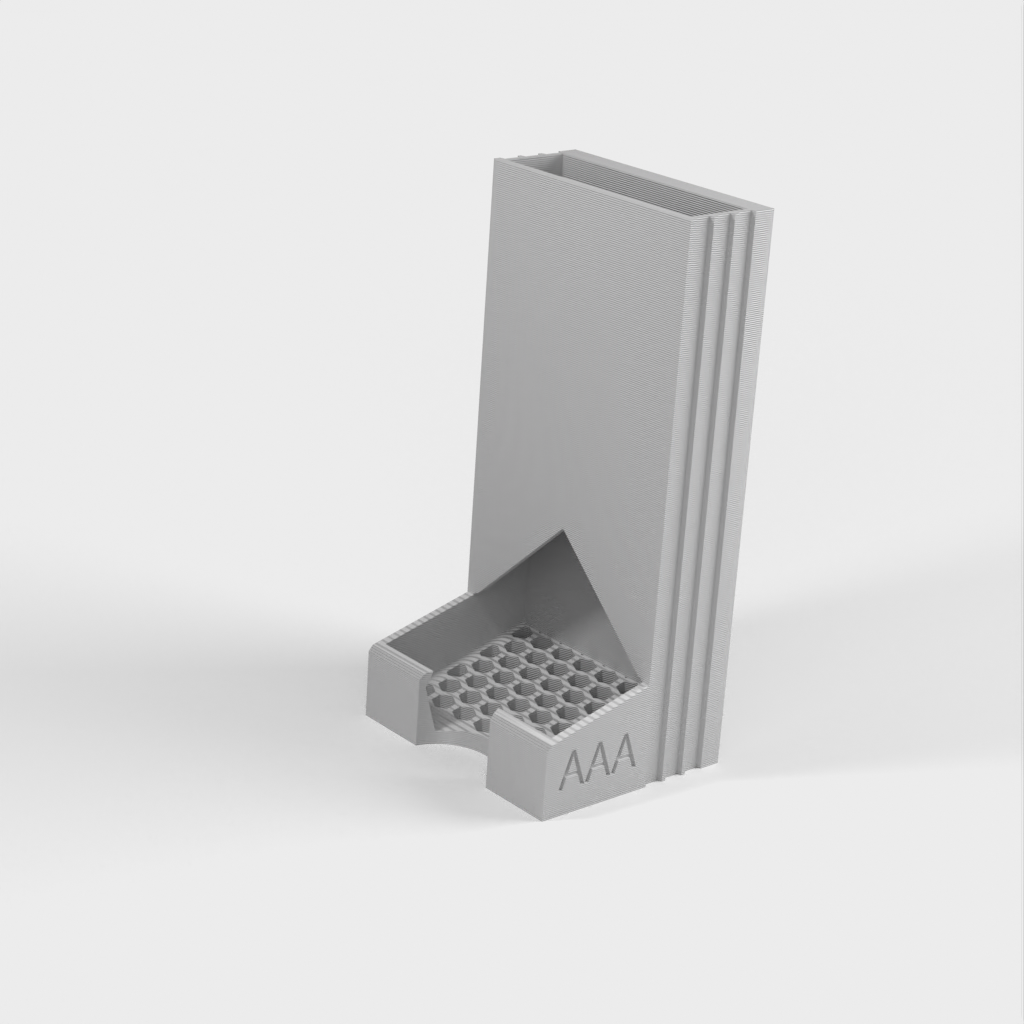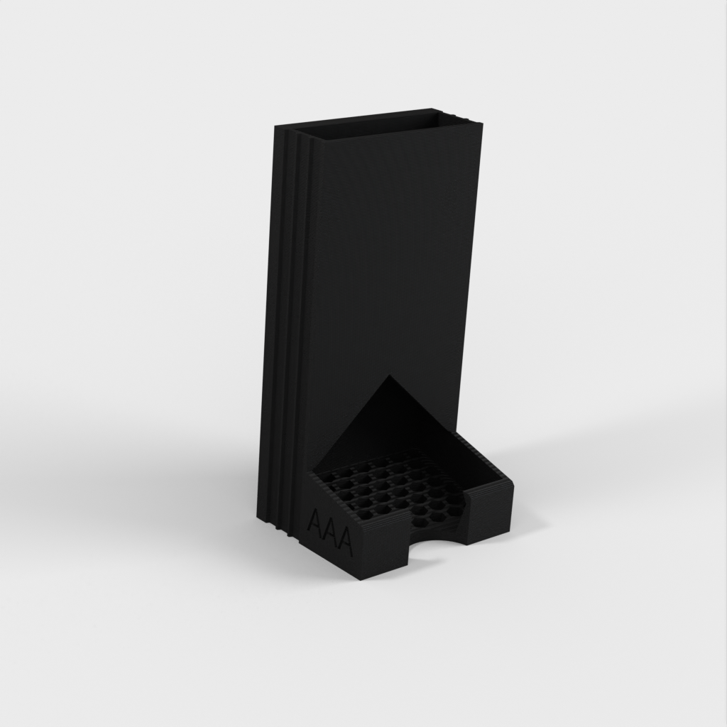 Batterihållare för AA- och AAA-batterier. Hållare kan monteras och ett väggfäste finns. Det är ett praktiskt och rymligt system för att förvara dina batterier och håller ditt område organiserat och snyggt.