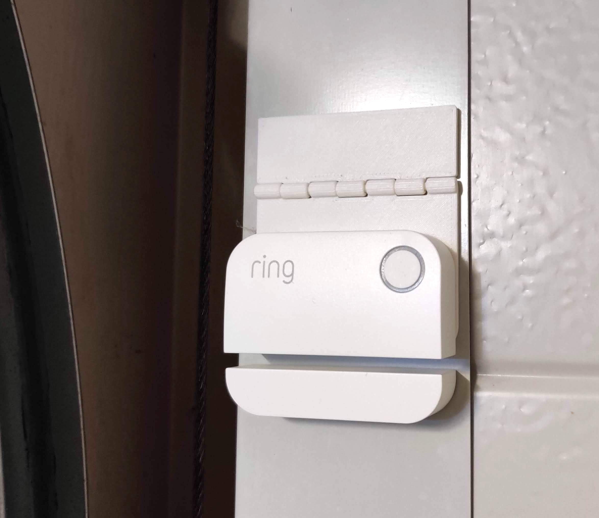 Garageportadapter för 2:a generationens ringlarmkontaktsensor är en enkel och snabb lösning för att säkra din garageport. Montera ringkontaktsensorn (den större delen) med den medföljande tejpen på gångjärnets längre lucka, precis på kanten. Använd en bit dubbelhäftande tejp eller liknande material för den kortare gångjärnsflippen på baksidan, för att fästa den på garageporten. Kontaktsensormagneten går precis under den (fäst den med det medföljande limmet direkt på garageporten), lämna ca 2-3mm mellan dem då det är mindre magnetisk attraktion. Denna design är baserad på Parametric Hinge scad. Parametrarna är finjusterade för att passa ringlarmskontaktsensorn och en nödvändig svängning, och en av flikarna klipptes för att göra den mindre.