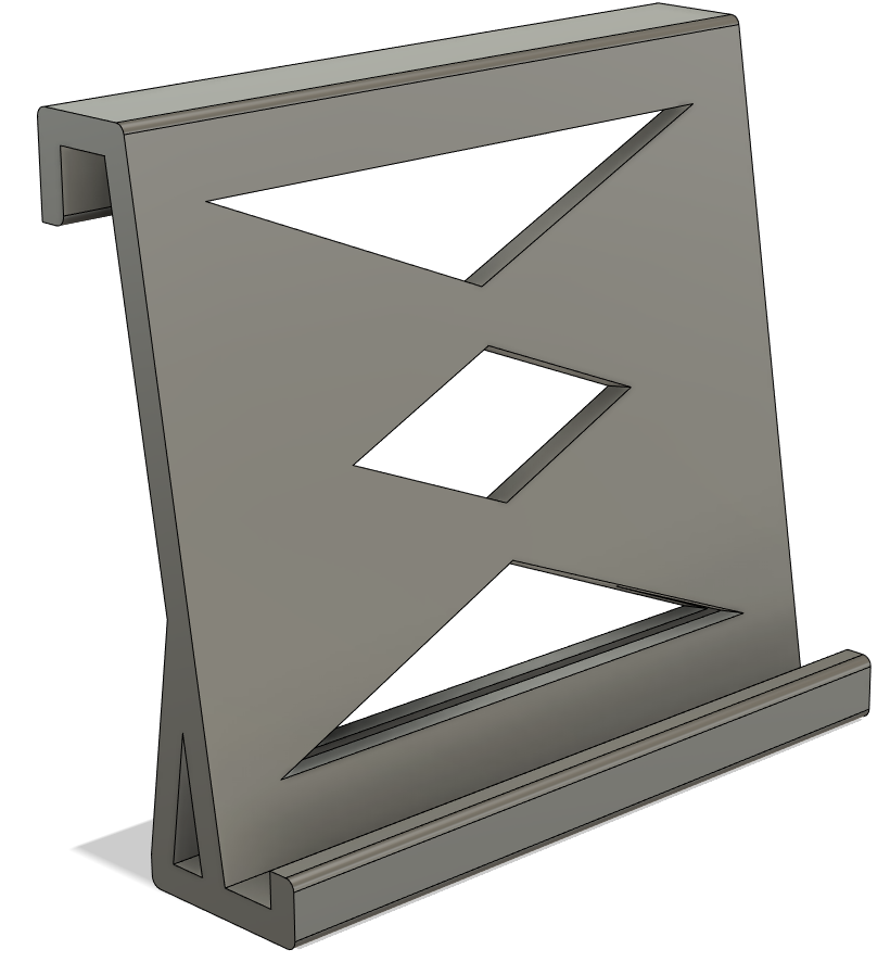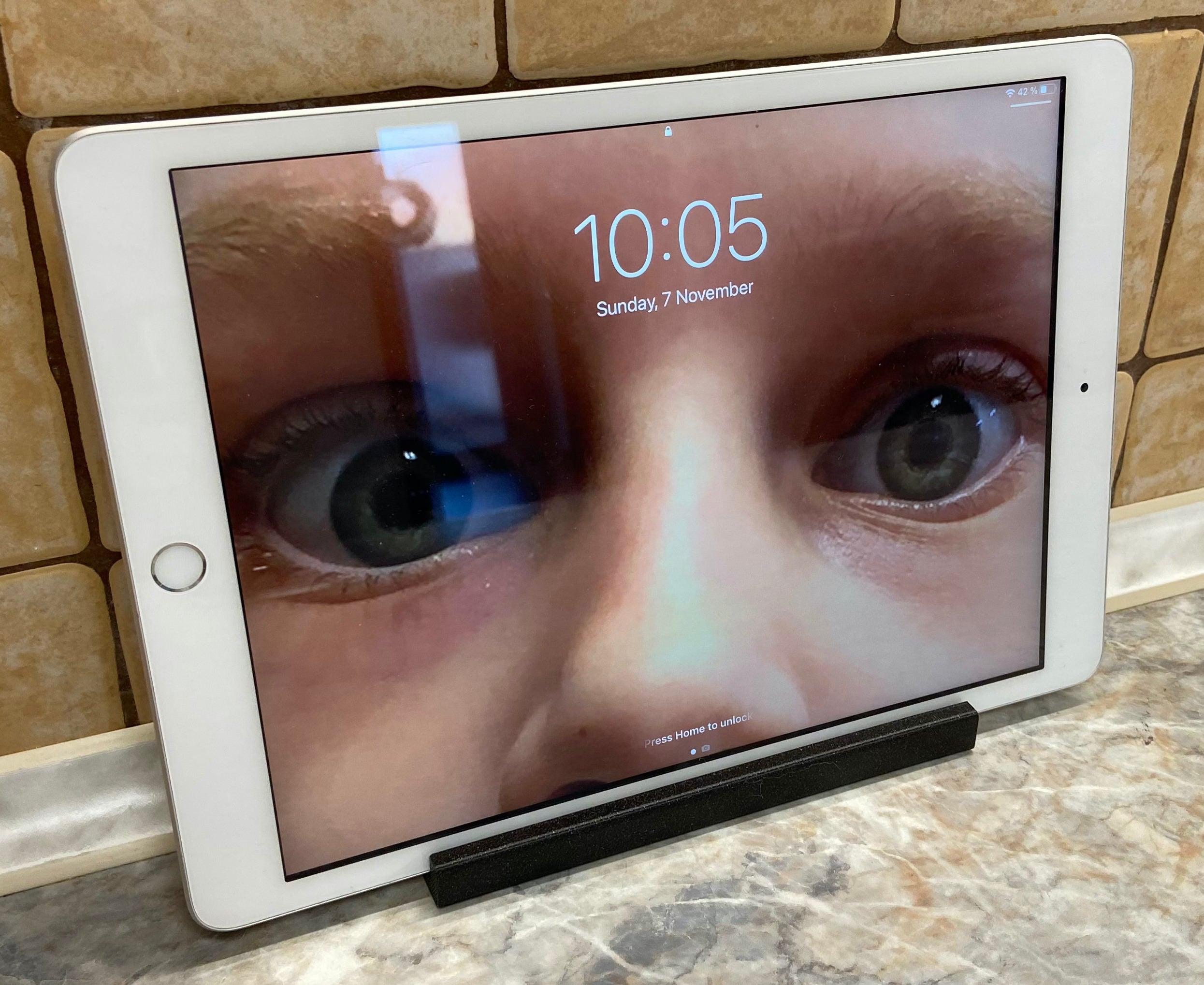 Detta är en iPad-hållare, designad för att minimera användningen av utrymmet i köket tack vare sin höga lutning. Hållaren kan tryckas utan stöd och är specialdesignad för att spara utrymme. Den är idealisk för dig som vill ha sin iPad säker och behändig när du lagar mat eller i andra sammanhang där det är nödvändigt att vara handsfree.