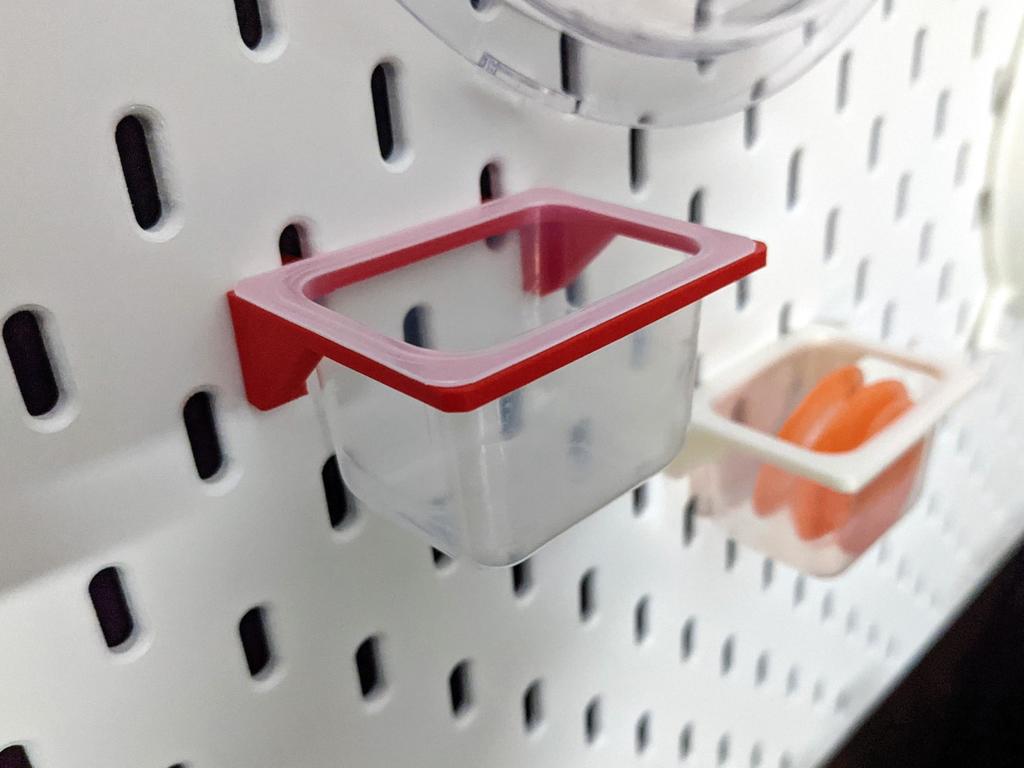 Detta är en hållare för lättviktsbehållare som passar IKEA SKÅDIS hängbräda. Den är speciellt utformad för att hålla mejeriprodukter som "Leckermäulchen" kvargbägare. Denna produkt innehåller OpenSCAD-filen så att du kan göra justeringar om det behövs.