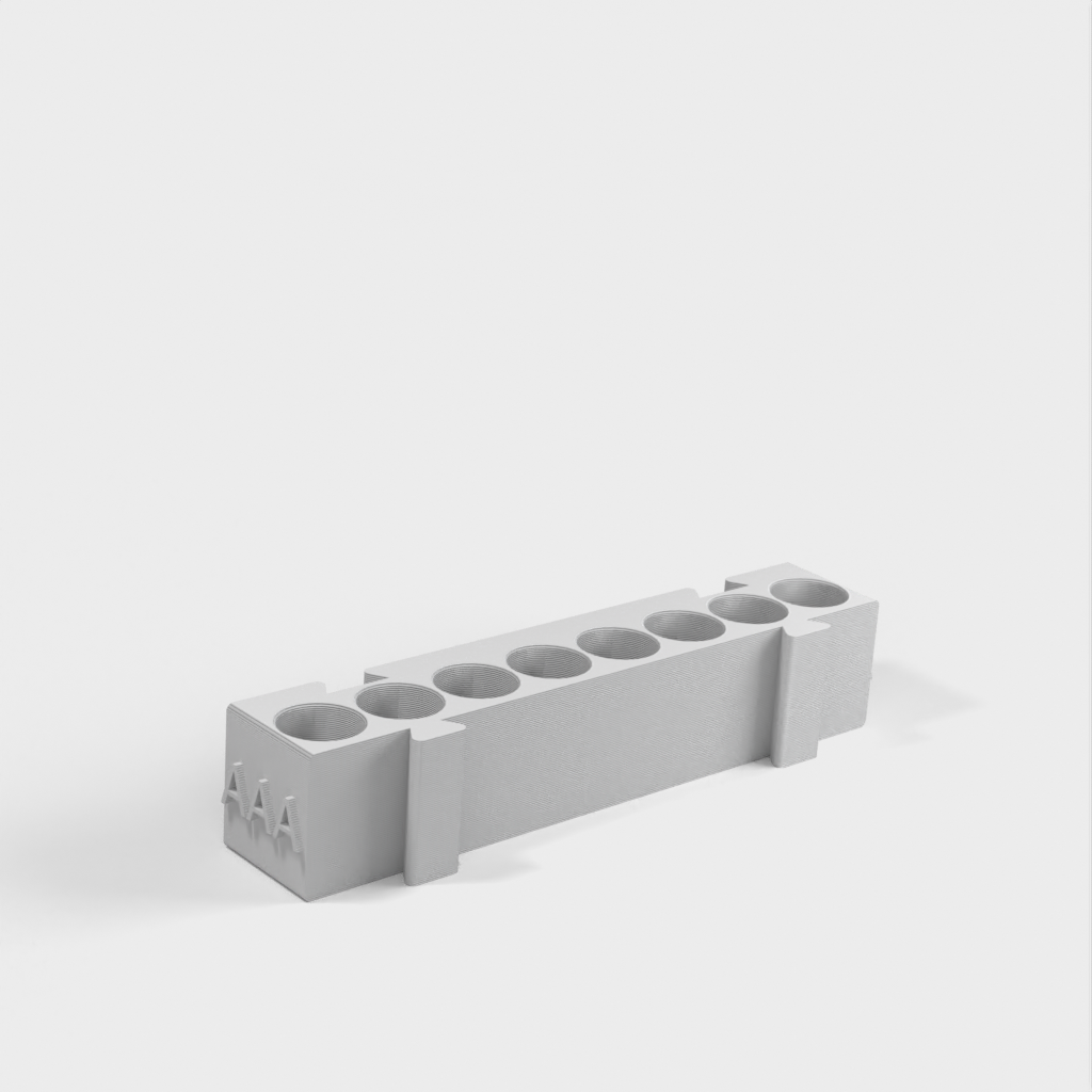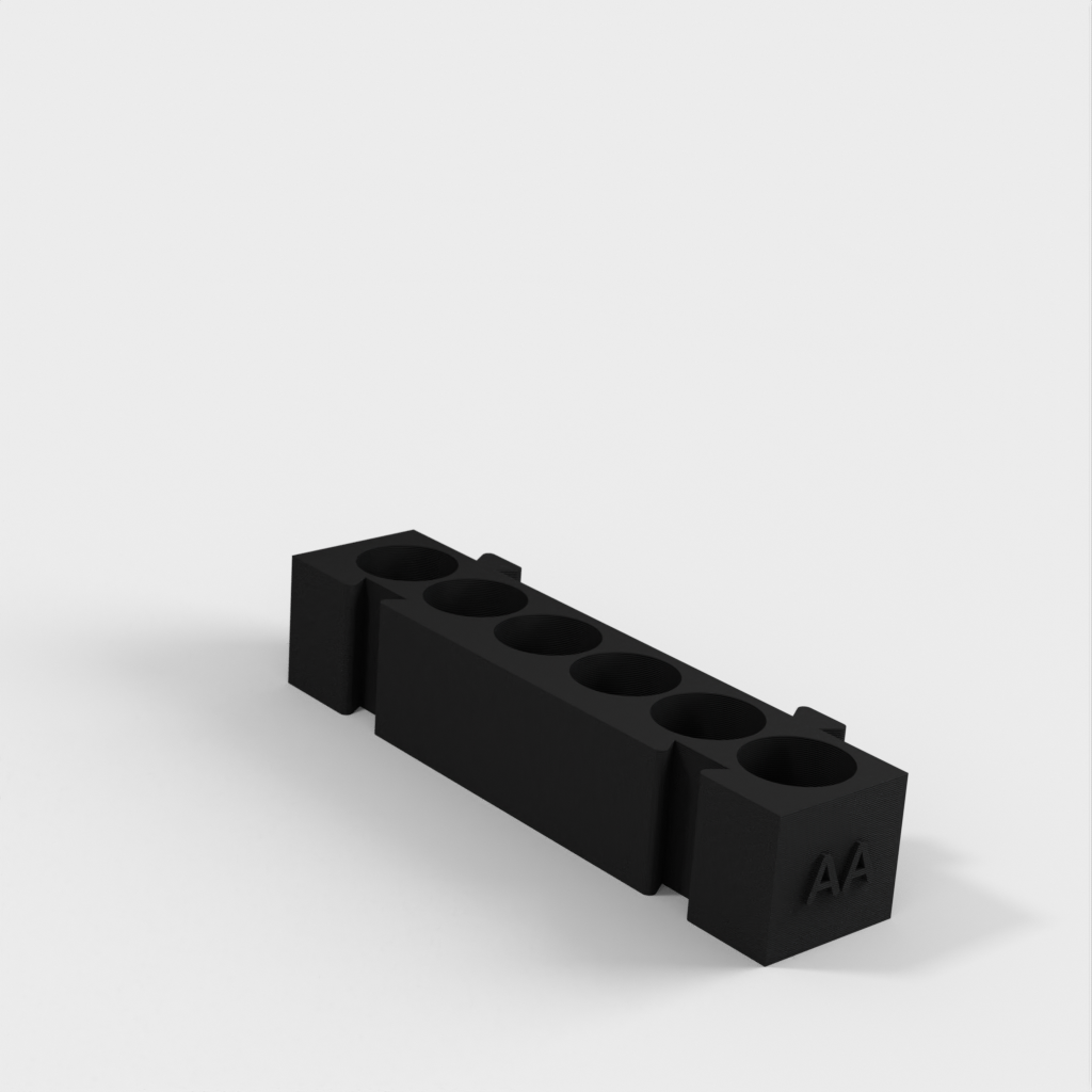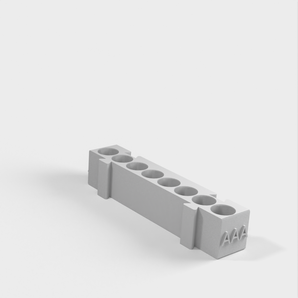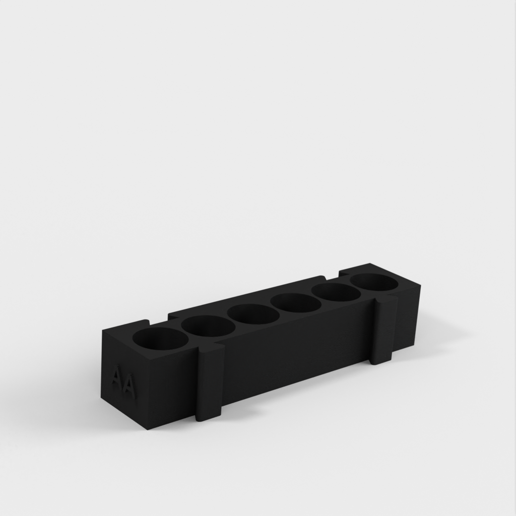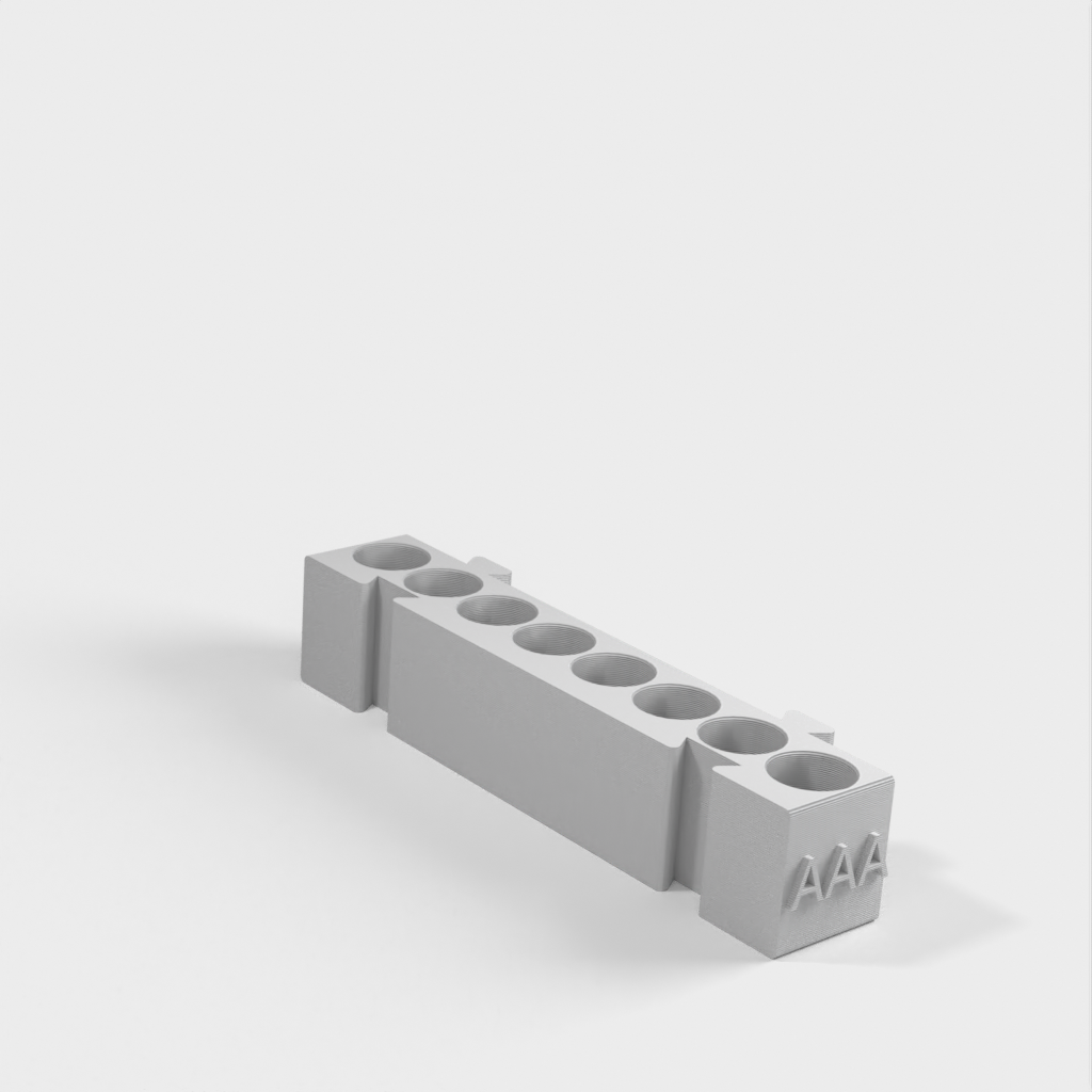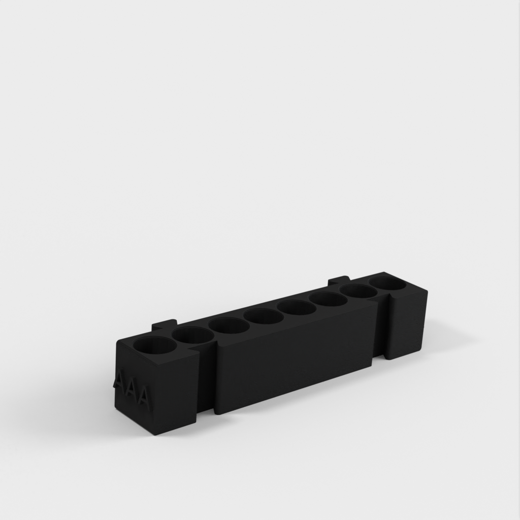 Detta är en modulär batterihållare som erbjuder olika hållare för varje typ av batteri. Alla hållare är lika långa och kan klippas ihop i vilken kombination du vill. Det är en idealisk lösning för att organisera skrivbordet och hålla reda på dina batterier. Att lägga till en AA-batterihållare och en mynthållare till samlingen ökar dess funktionalitet ytterligare.