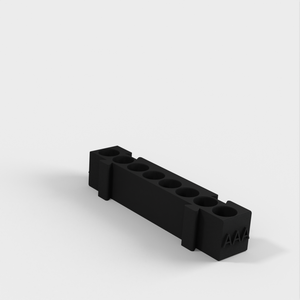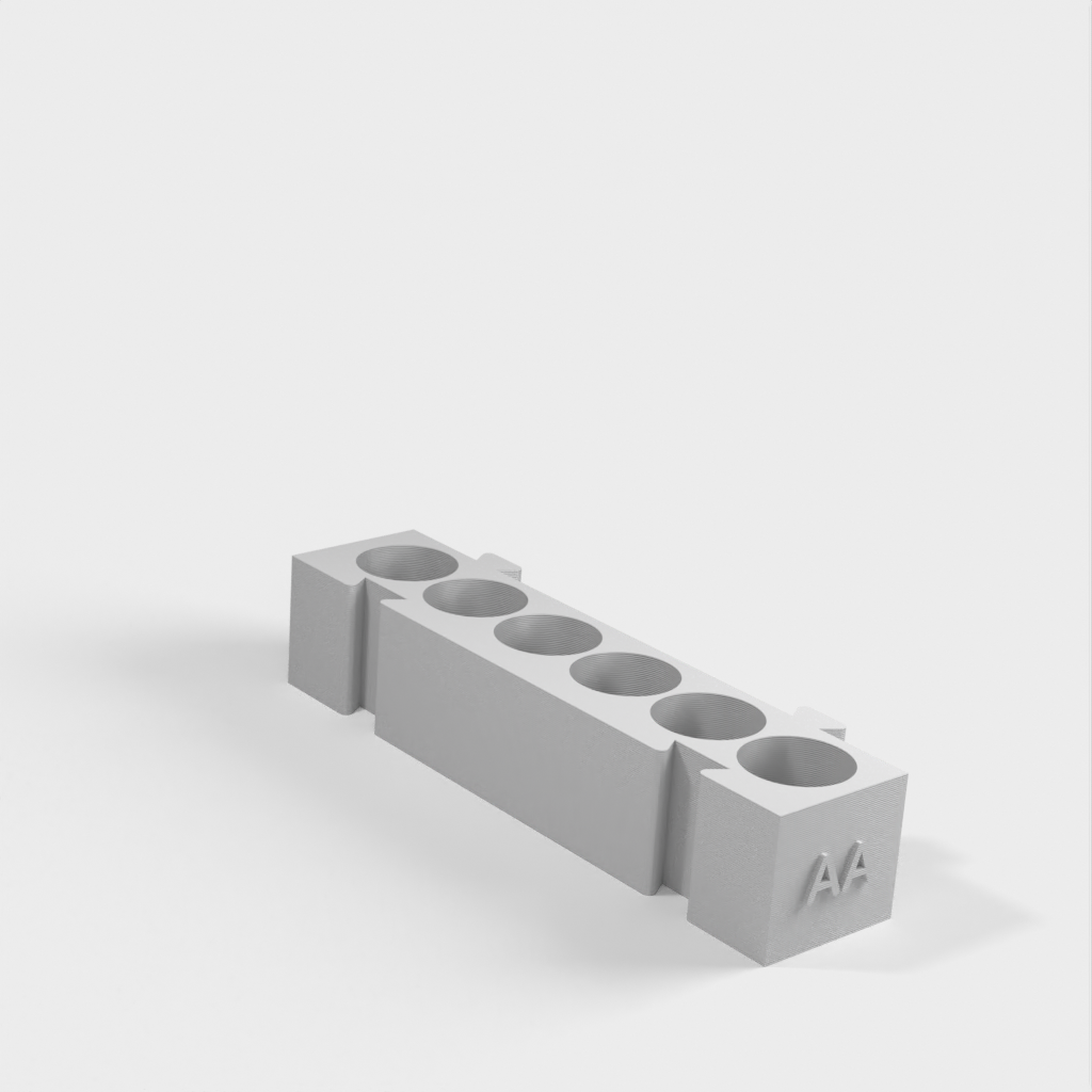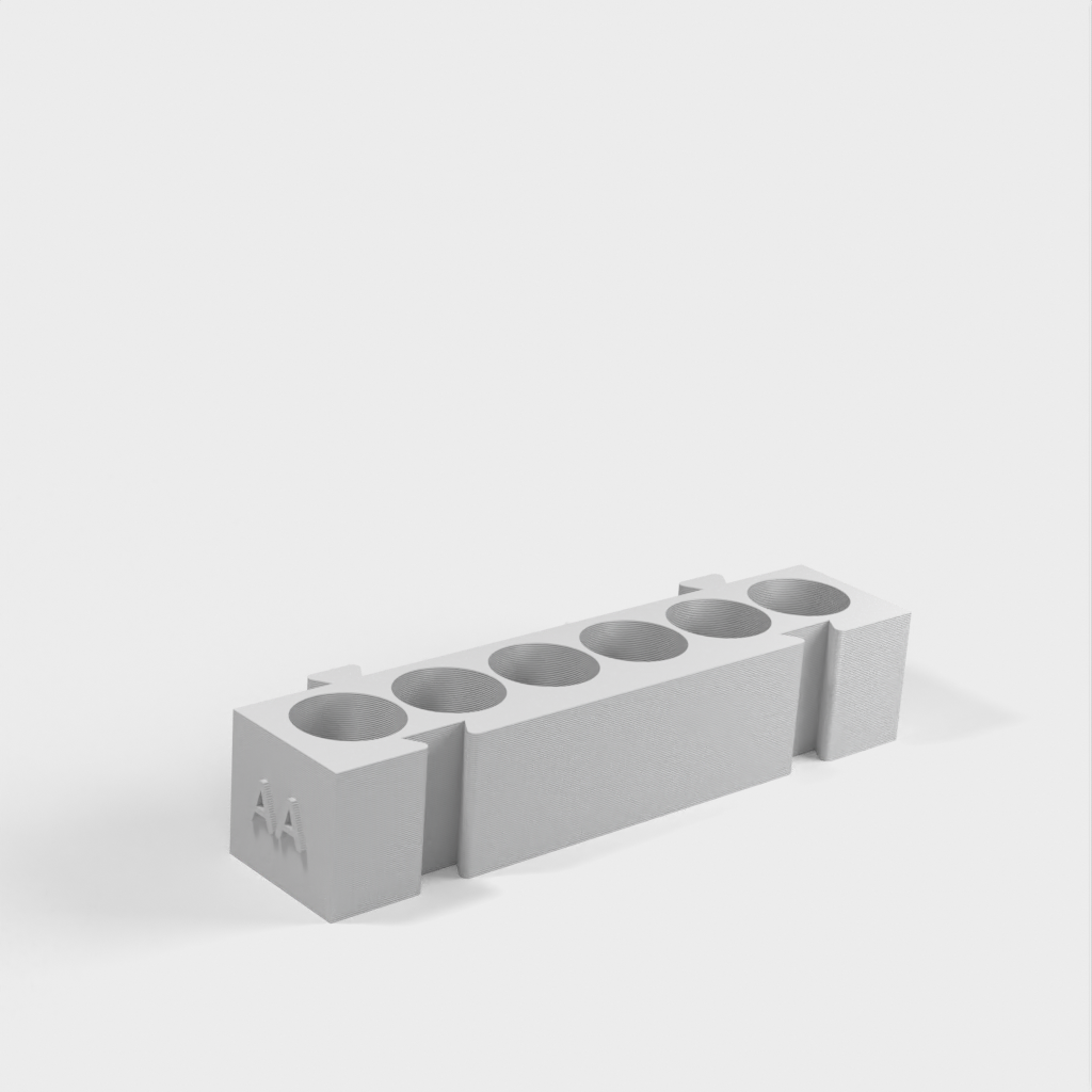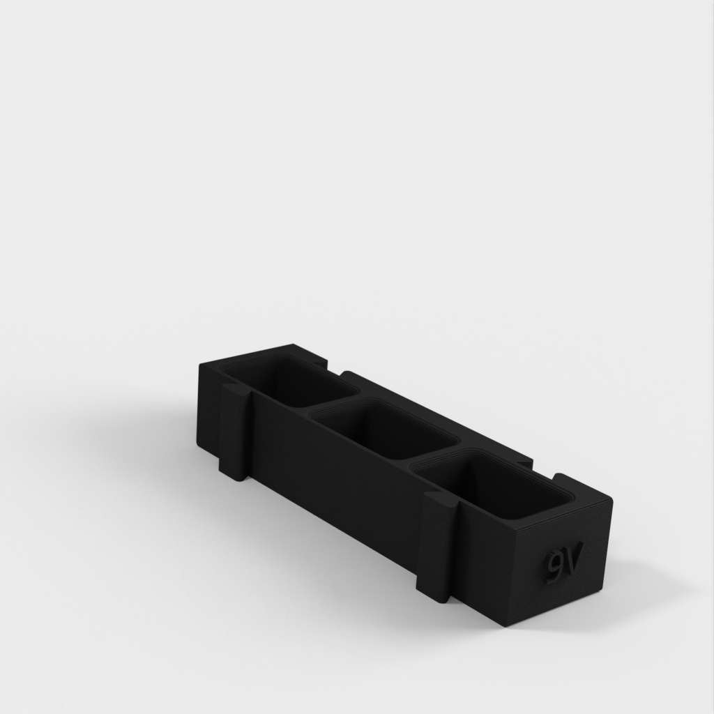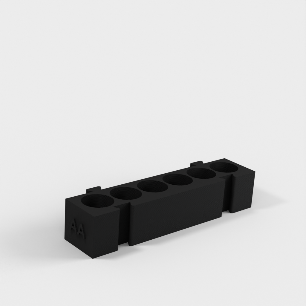 Detta är en modulär batterihållare som erbjuder olika hållare för varje typ av batteri. Alla hållare är lika långa och kan klippas ihop i vilken kombination du vill. Det är en idealisk lösning för att organisera skrivbordet och hålla reda på dina batterier. Att lägga till en AA-batterihållare och en mynthållare till samlingen ökar dess funktionalitet ytterligare.