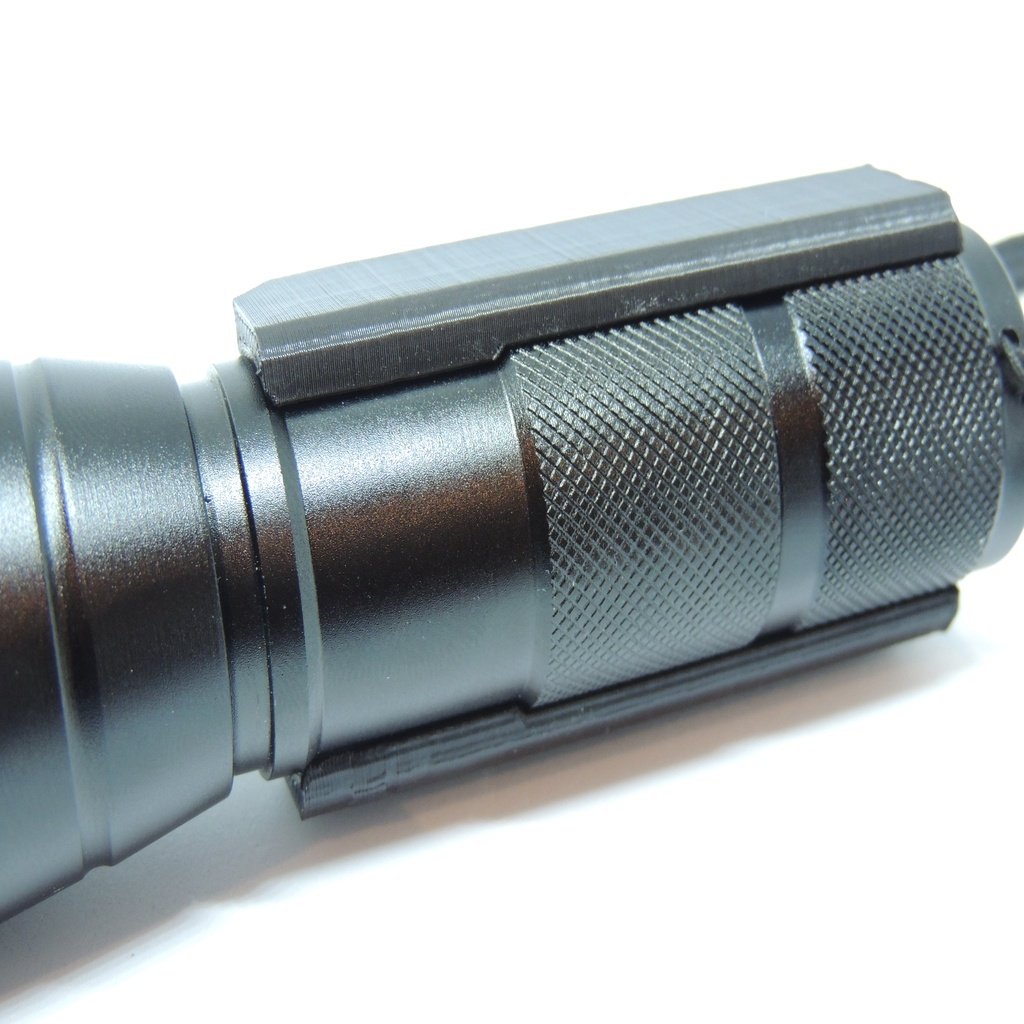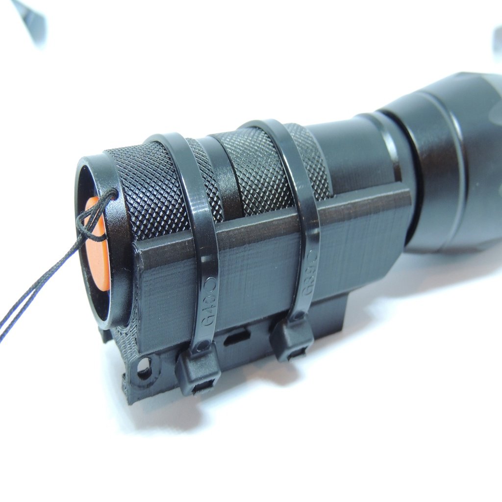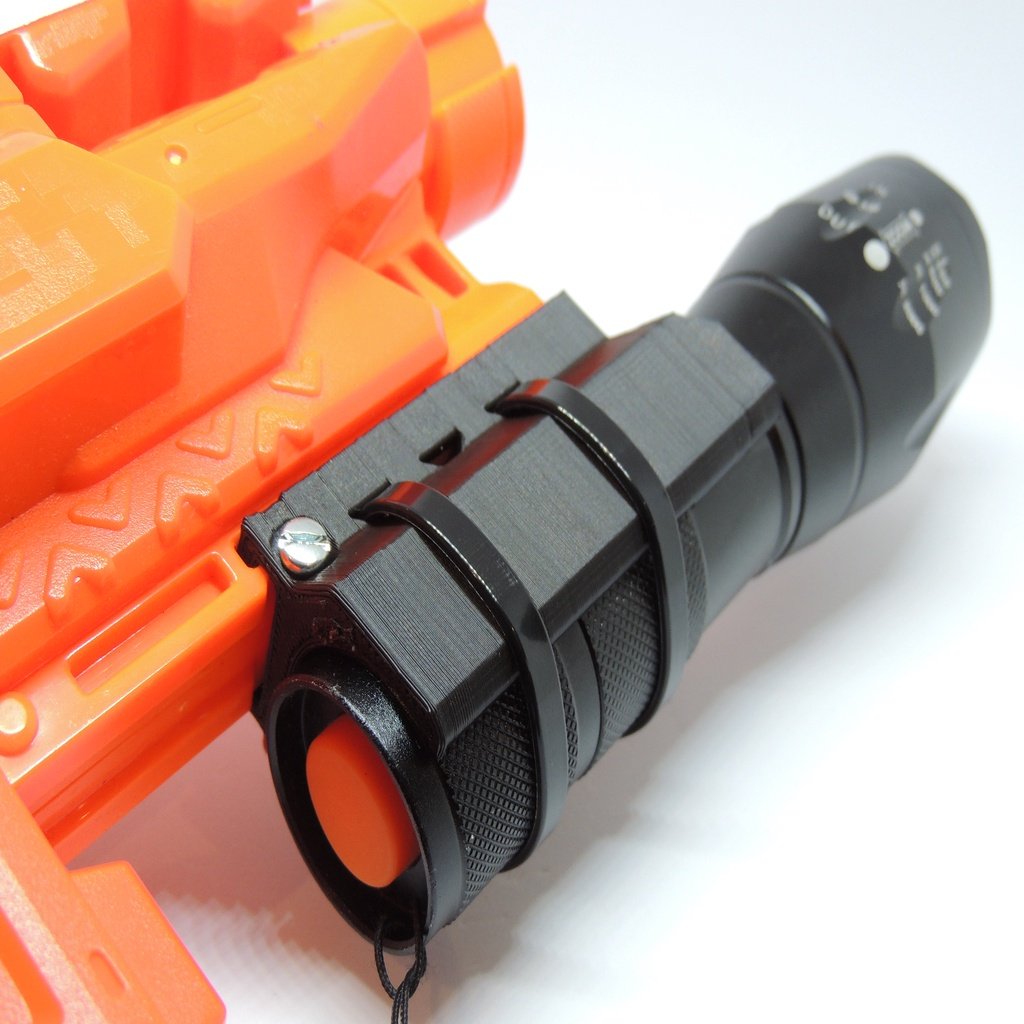 Detta är ett taktiskt ficklampsfäste för Nerf Elite Rails. Designad för de zoombara 2000 Lumen LED-fickorna som du kan hitta på Amazon. Delarna som behövs är: 2 eller 3 buntband, en M3-skruv 25 mm lång, M3-mutter, en ficklampa och en Nerf-pistol. Hålen tar en M3-bult genom dem och är designade för att sitta i urtagen på Nerf Rail. Detta förhindrar att tillbehöret faller av. De 3 hålen på sidan är för buntband för att hålla brännaren på plats. Detta är utformat för att skriva ut stående utan stöd, vilket också ger den största styrkan för att hålla facklan. Observera att detta bara fungerar med Elite Rails och endast har testats på en Stryfe.
