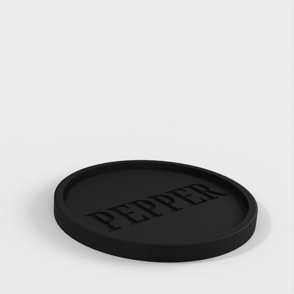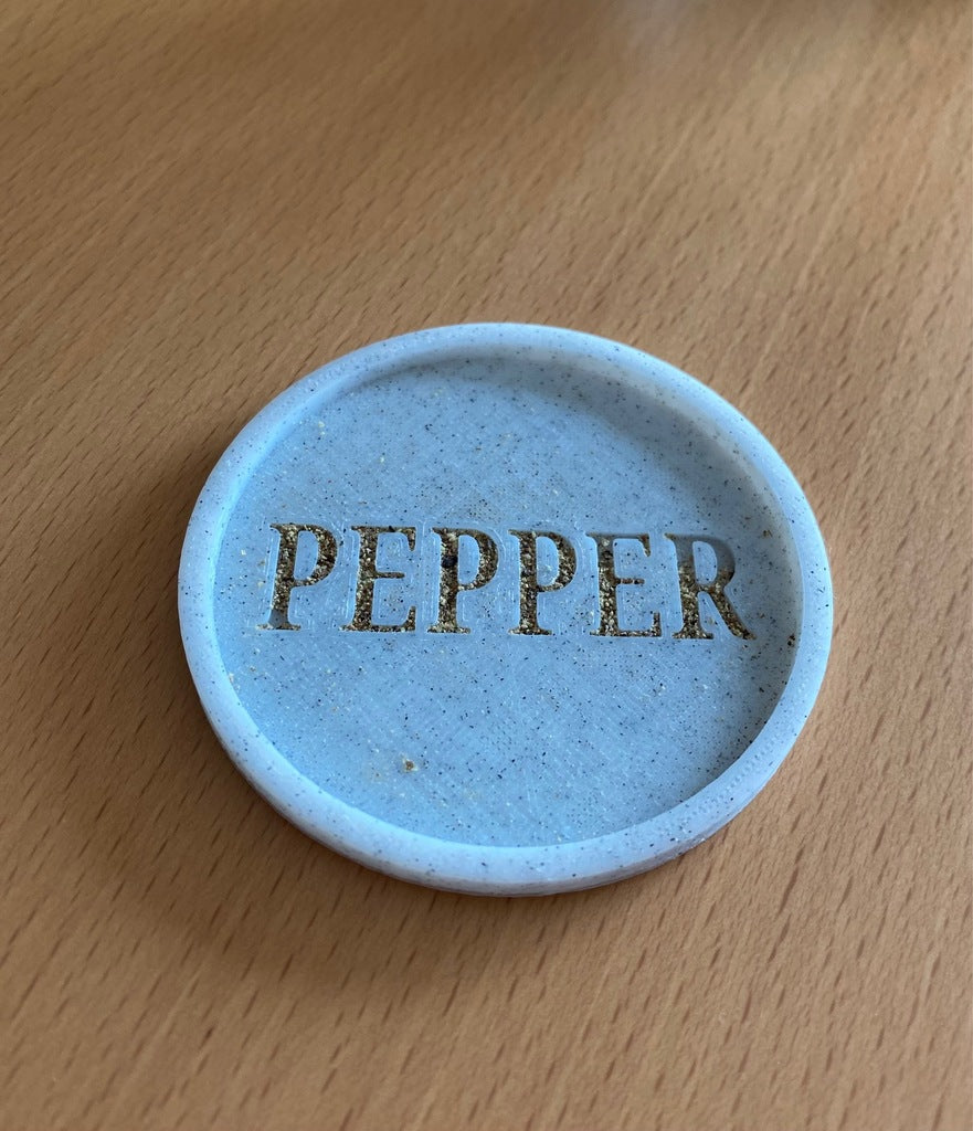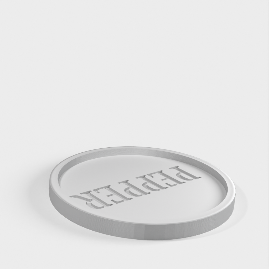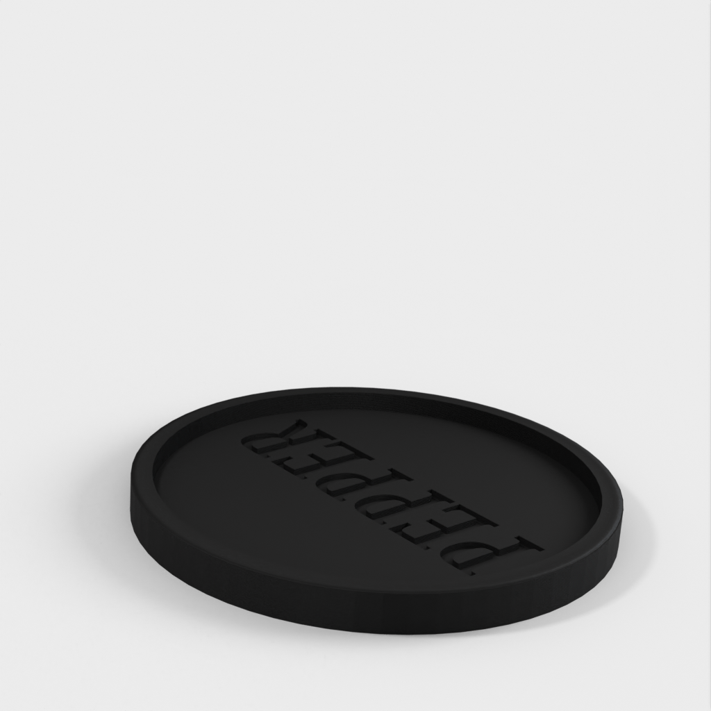 En rolig detalj är ordet "peppar" tryckt som negativt utrymme längst ner på brickan, som fylls upp med mald peppar. När den är helt fylld, överväg att lägga till ett lager av livsmedelssäkert harts för att låsa paprikan i ordet "peppar".