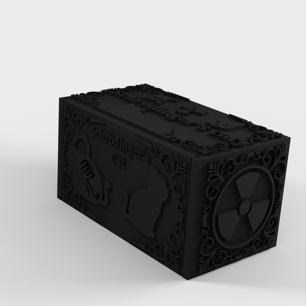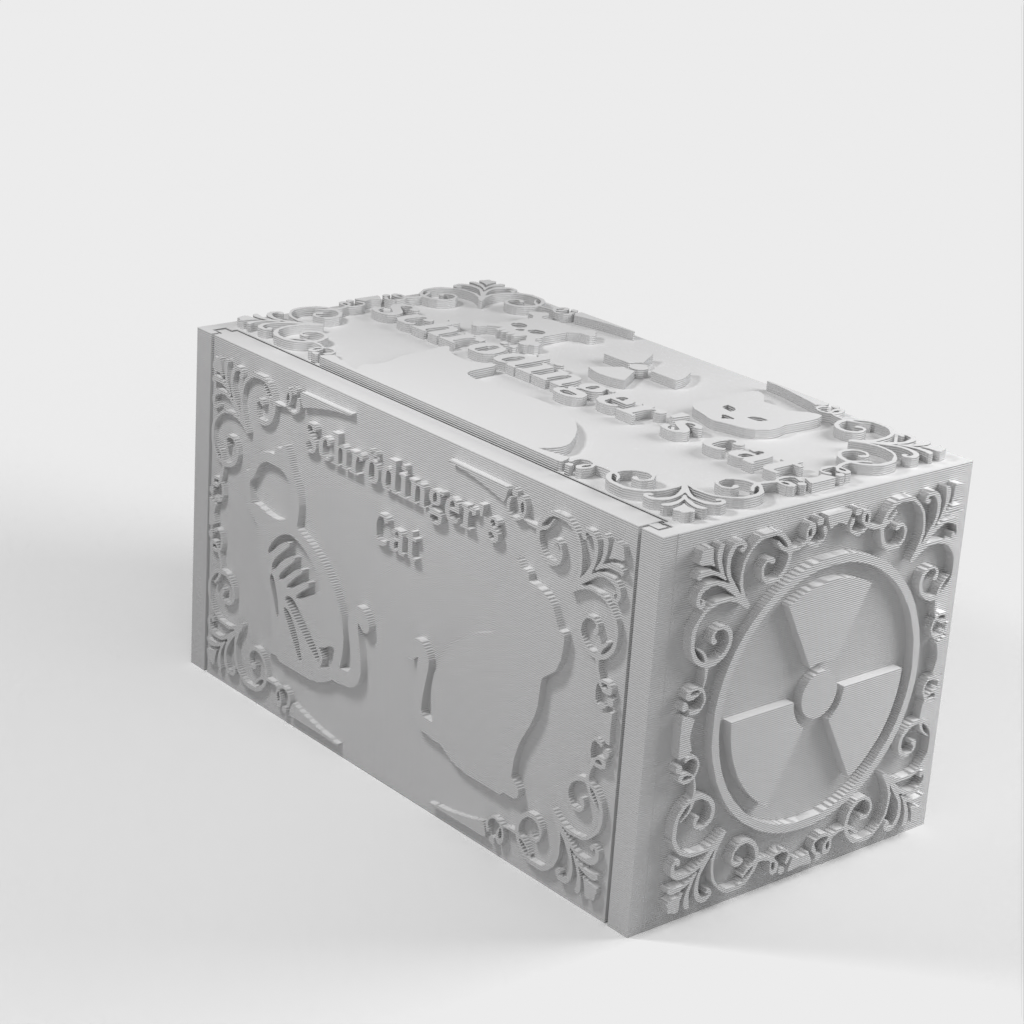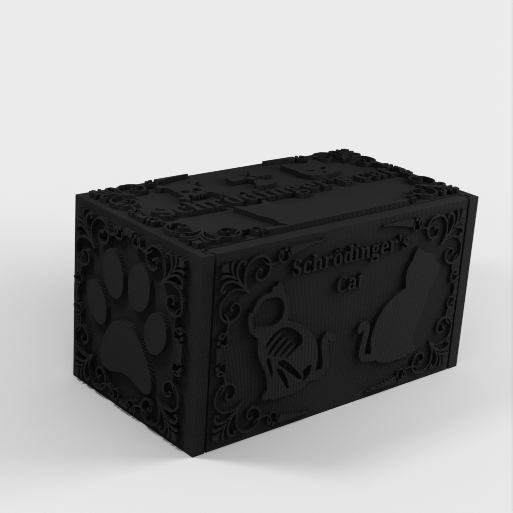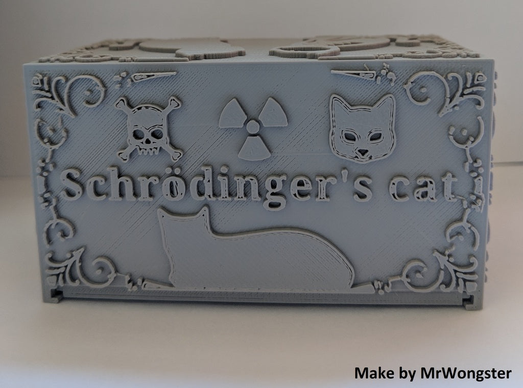 Schrödingers katt är en 3D-utskriftsmodell som lyckas illustrera Erwin Schrödingers tankeexperiment. När du har laddat ner de nödvändiga filerna kan du välja en slumpmässig STL-fil som innehåller antingen en levande eller en död katt. Oavsett om du väljer det ena eller det andra så upptäcker du vilken modell du har valt först när utskriften är klar och du öppnar lådan. Denna produkt fungerar som en konversationsstartare, illustration av kvantfysik och en rolig skrivbordsdekoration för alla fysikentusiaster.