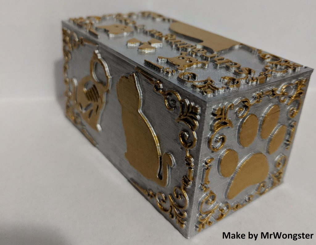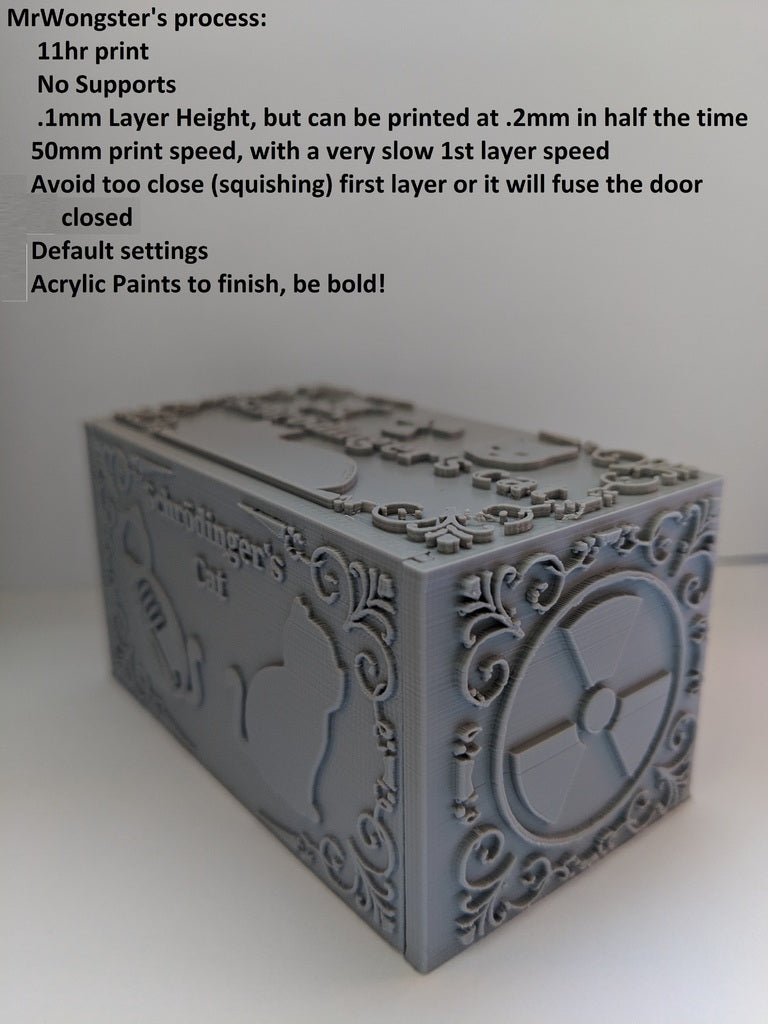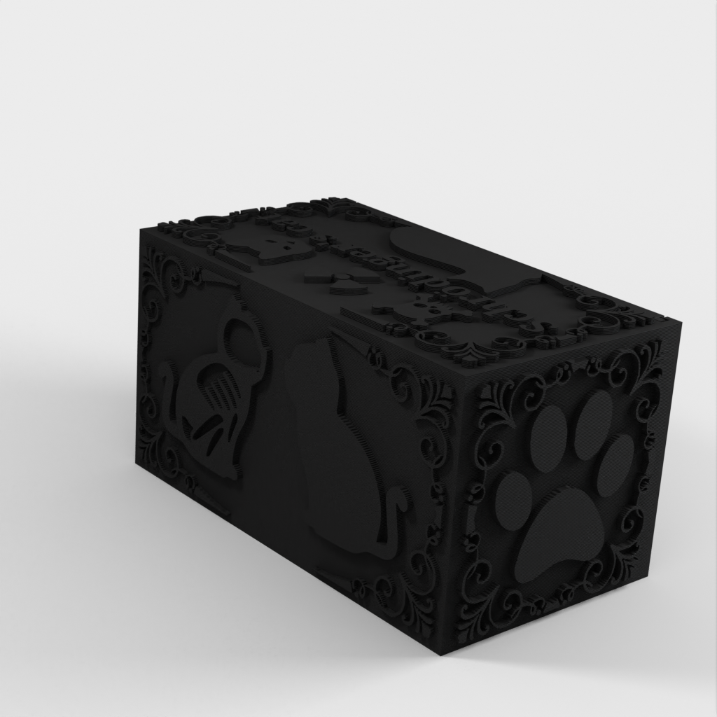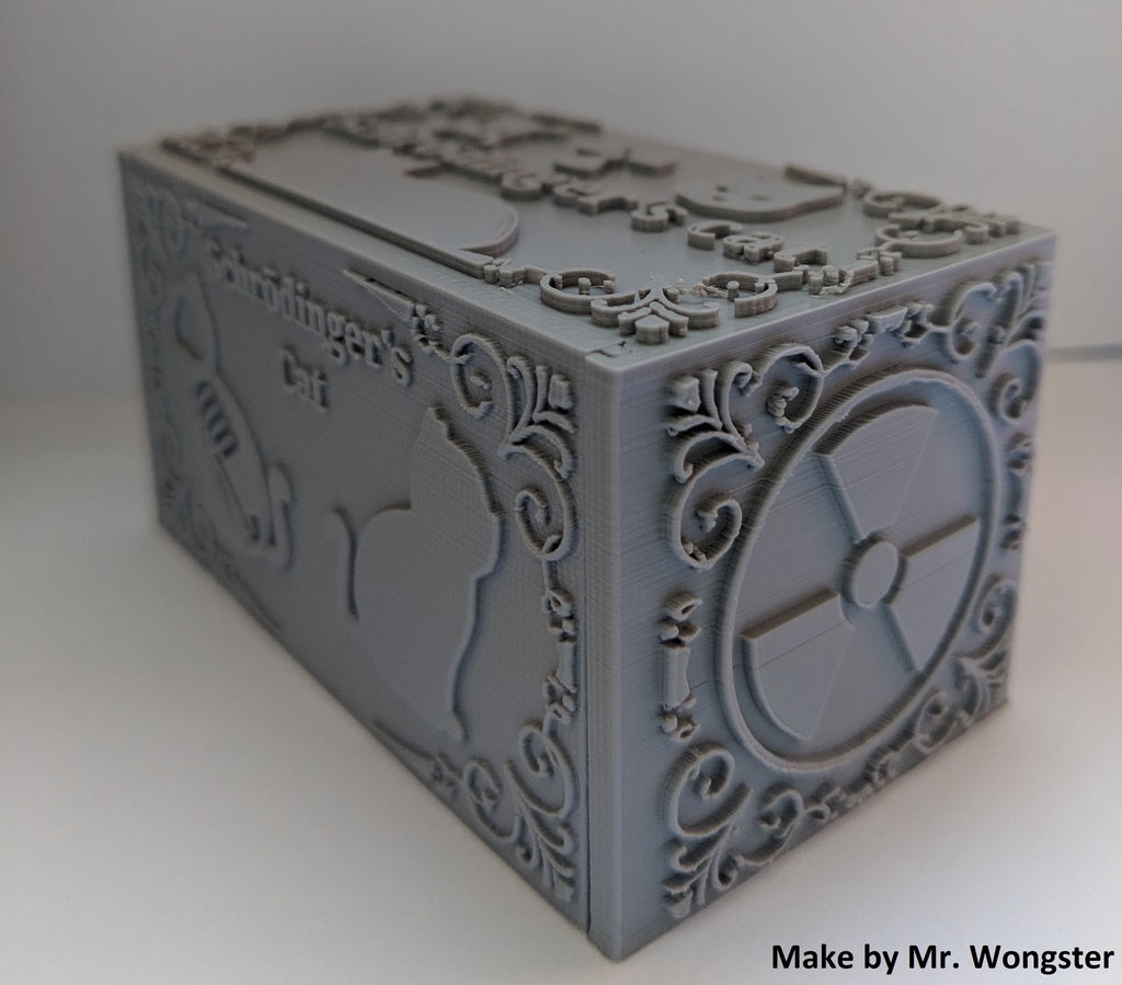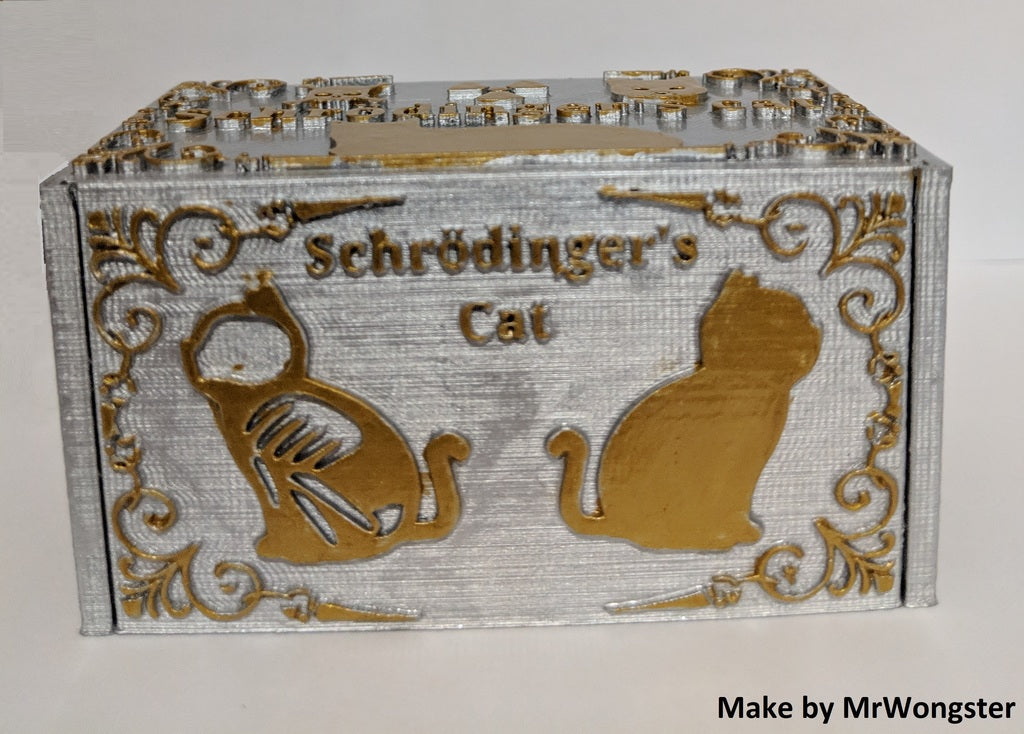Schrödingers katt är en 3D-utskriftsmodell som lyckas illustrera Erwin Schrödingers tankeexperiment. När du har laddat ner de nödvändiga filerna kan du välja en slumpmässig STL-fil som innehåller antingen en levande eller en död katt. Oavsett om du väljer det ena eller det andra så upptäcker du vilken modell du har valt först när utskriften är klar och du öppnar lådan. Denna produkt fungerar som en konversationsstartare, illustration av kvantfysik och en rolig skrivbordsdekoration för alla fysikentusiaster.
