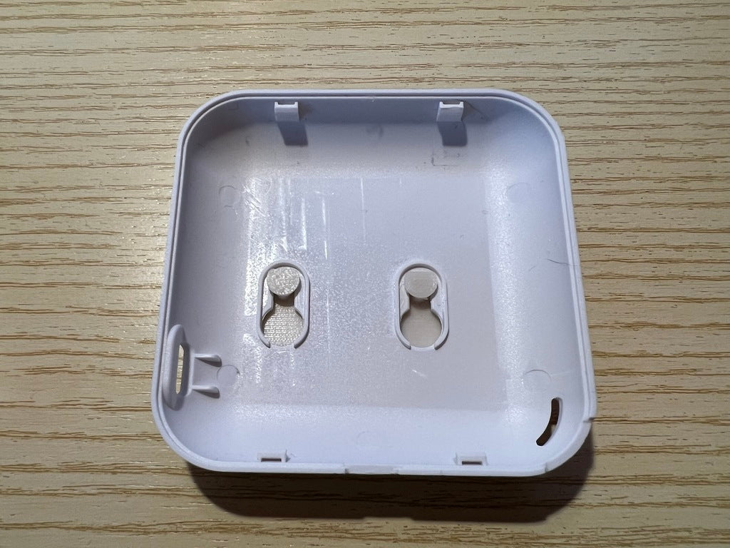 Shelly Plus H&T väggfäste/bakplatta är designad för att vara så tunn som möjligt, men ändå stark nog att hålla din Shelly-enhet. Du kan använda en stark dubbelhäftande tejp, som den medföljande 3M, för att fästa din Shelly på väggen och enkelt ta bort den när du behöver byta batterier.