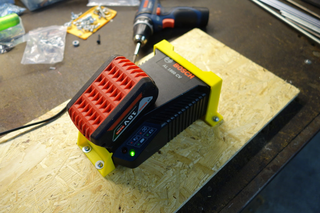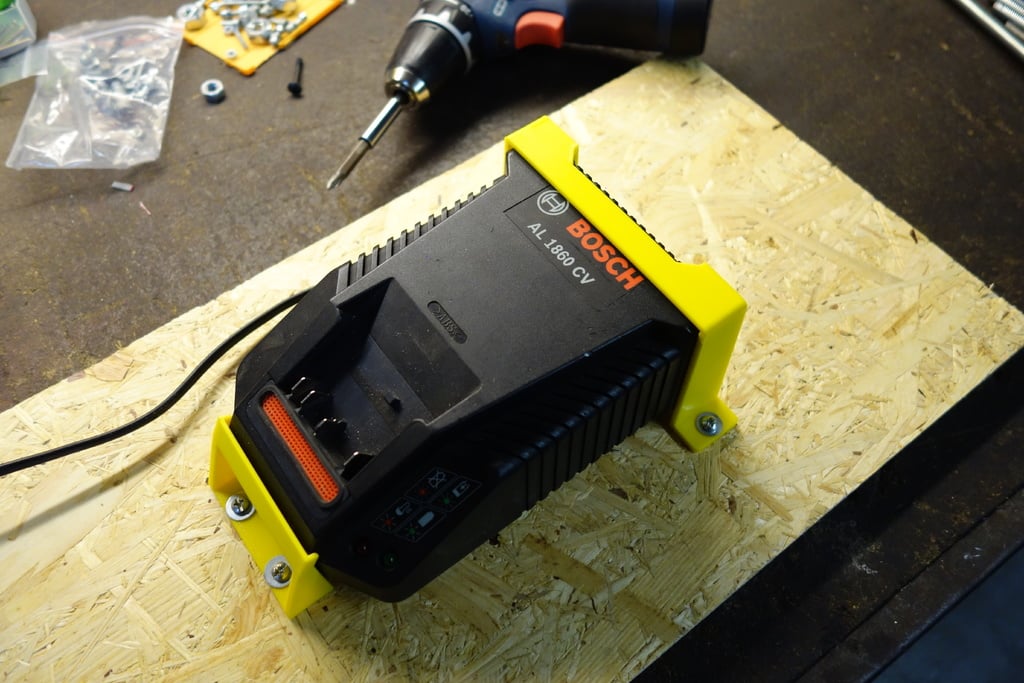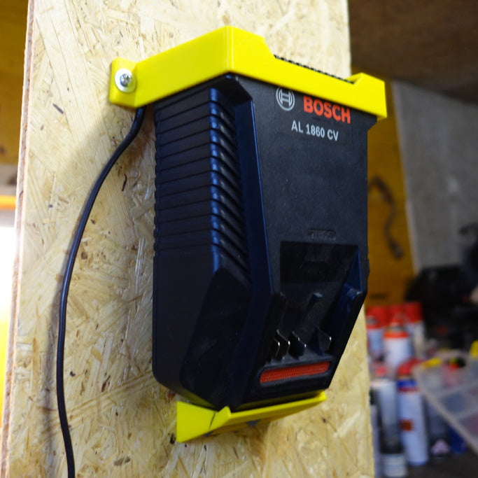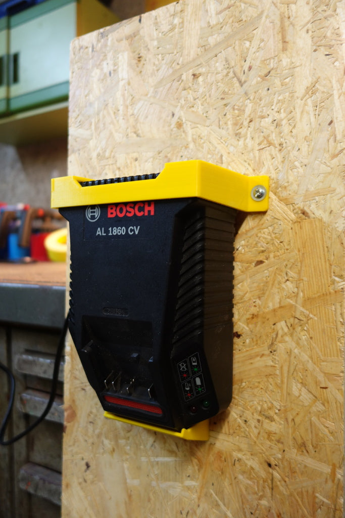 Detta väggfäste är designat för min Bosch AL 1860 CV-laddare (BC 630 US-version) så att jag kan montera min laddare på en vägg. Det betyder att den tar mindre plats på mitt skrivbord.