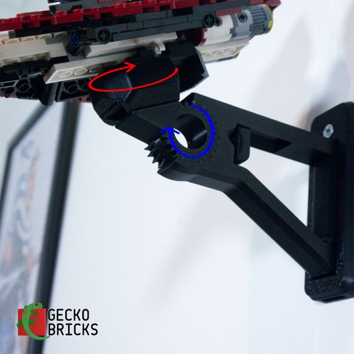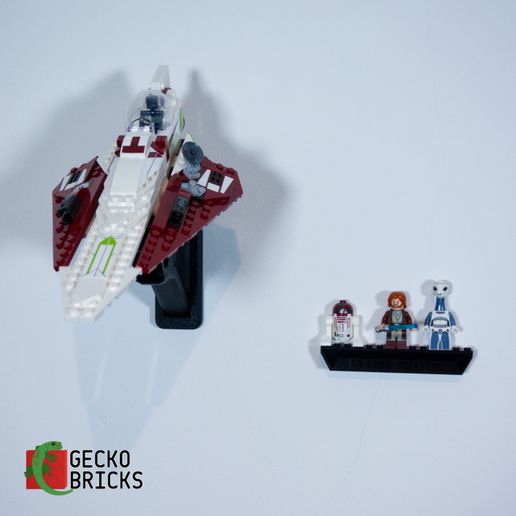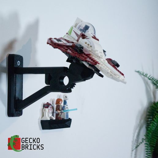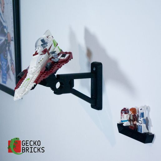Detta justerbara väggfäste gör det möjligt att visa upp din Star Wars Starfighter i olika vinklar. Fästet är utformat för enkel montering och snabb borttagning av modellen. En separat hållare för minifigurer medföljer, som monteras säkert och skonsamt med en 3M-strip.