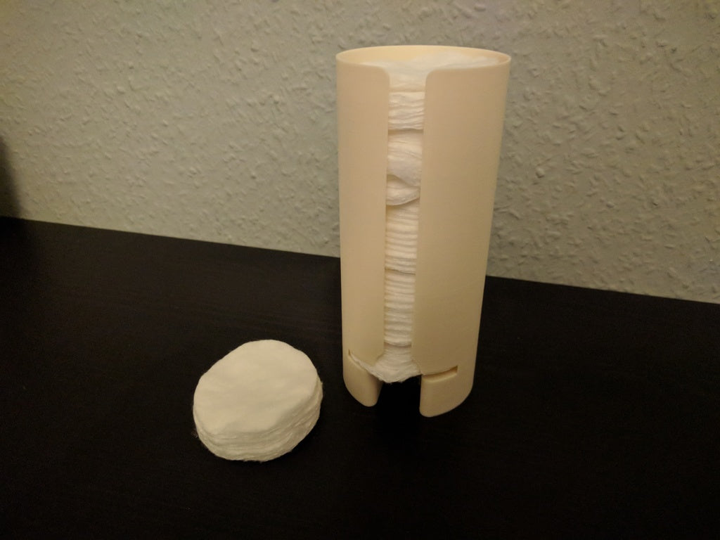Detta är en praktisk dispenser för bomullsrondeller som enkelt kan monteras antingen på väggen eller inuti ditt skåp. Genom att hålla dina bomullsrondeller prydligt organiserade och borta från ytan, sparar den värdefullt förvaringsutrymme i din låda eller skåp. En idealisk lösning för ett snyggare och mer organiserat badrum. 3D-utskriven.