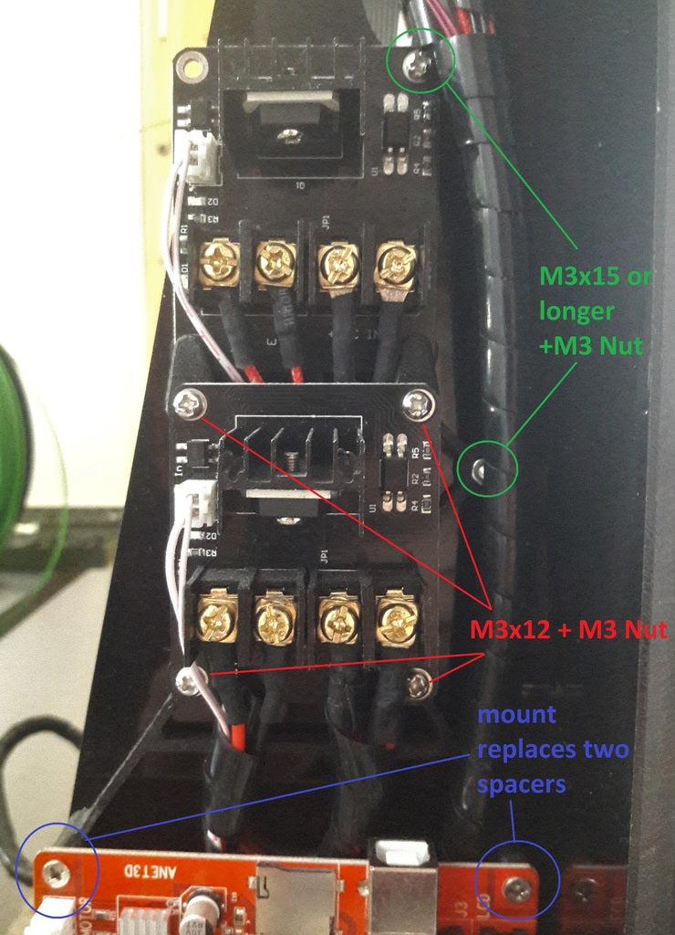 - Effektiv montering av två MOSFET-element (hotbed och hotend) på Anet A6-ramen.