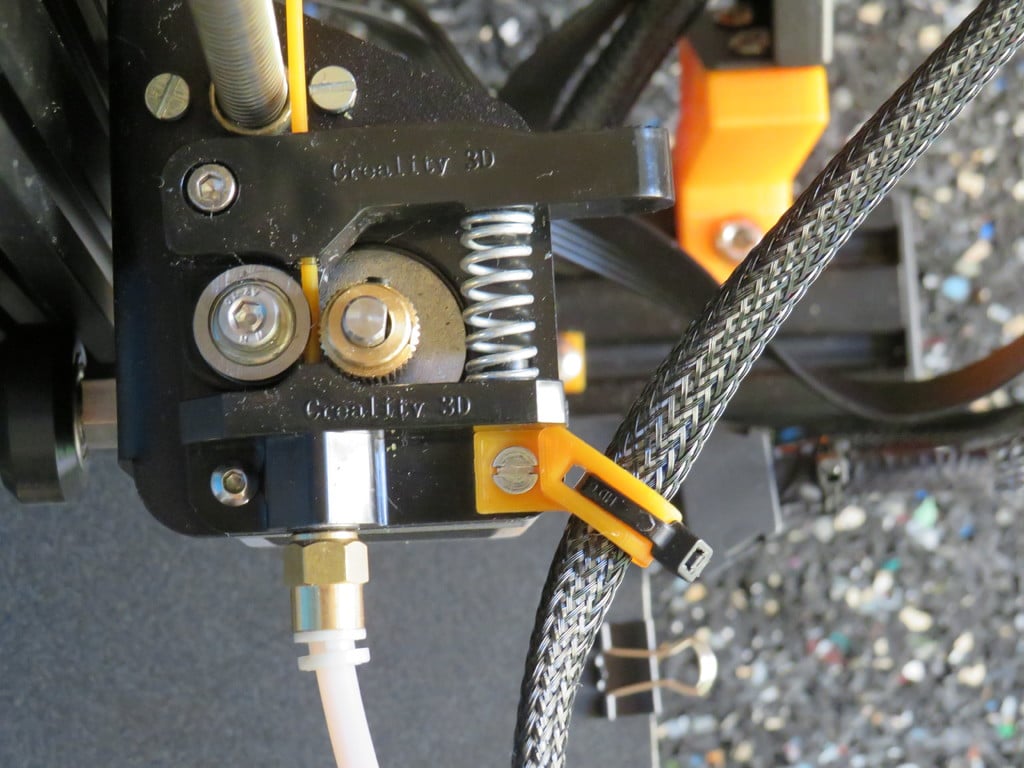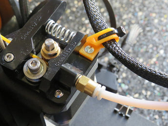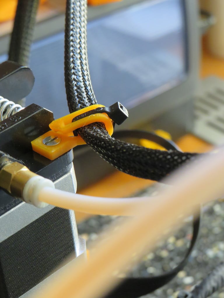För installation krävs en skruv som är något längre än originalet för att säkerställa en stabil infästning. Även om det inte är absolut nödvändigt kan ett valfritt buntband användas för extra säkerhet och för att hålla kablarna prydligt på plats, vilket bidrar till en organiserad installation av din 3D-skrivare. Detta enkla men effektiva tillbehör hjälper till att hålla din arbetsyta snygg och dina kablar skyddade.