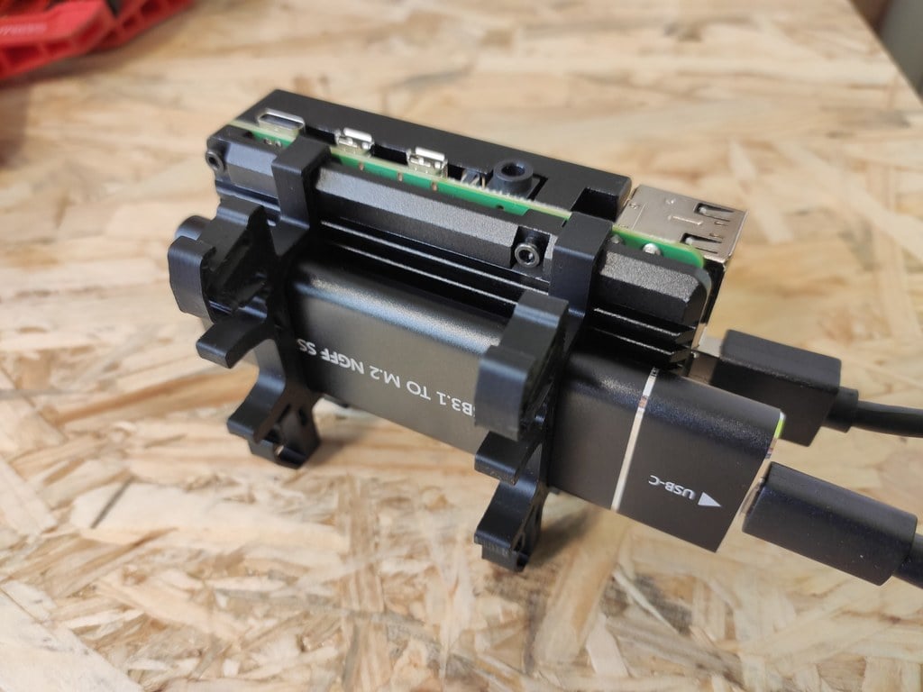 Fästet är utformat för att bevara den effektiva kyllösningen i Raspberry Pis Armor Case, vilket är avgörande för att upprätthålla stabil och optimal prestanda under drift. Installationen är enkel; fästet klickas helt enkelt fast på baksidan av Armor Case utan behov av skruvar, vilket säkerställer en snabb och säker montering. Dessutom finns det ett praktiskt inbyggt fack för en extern USB3 M.2-disk, vilket möjliggör utökad lagringskapacitet precis bredvid din Raspberry Pi.