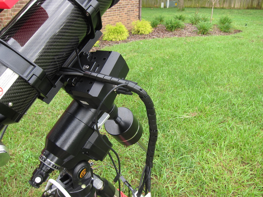 Detta fäste är utformat för att ge effektiv kabelhantering på stativbenen på Exos-2-teleskopfästet. Det fungerar som en robust kabelhållare som hjälper till att säkra kablarna från PMC-Eight-kontrollboxen till fästet. Detta minimerar risken för att kablar fastnar eller trasslar ihop sig när teleskopet roterar, vilket kan förhindra att motorerna stannar och potentiellt skadar utrustningen. Förutom primära styrkablar kan detta kabelklämma också användas för att säkert hålla värmetrådar och kablar till astrofotograferingskameror, vilket bidrar till en mer organiserad och problemfri observationssession.