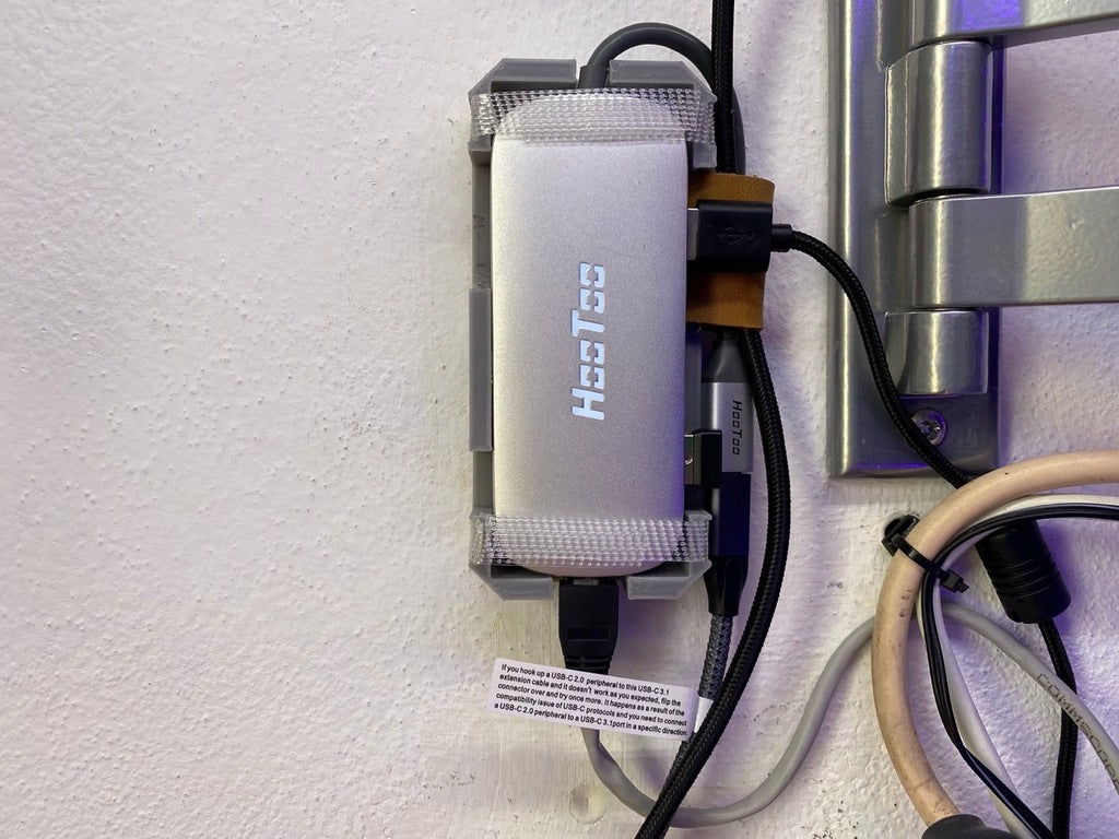 Denna **kabelhållare** låter dig enkelt hantera dina anslutningar och hålla ordning på din installation. Den är idealisk för användning med en USB-C-förlängningskabel, vilket ger dig flexibilitet i hur du placerar din hubb. Även om hållaren är fast är den utformad så att din enhet enkelt kan tas bort och transporteras, till exempel om du behöver använda den på kontoret eller någon annanstans, vilket ger en bekväm och portabel lösning för din USB-C-hubb.