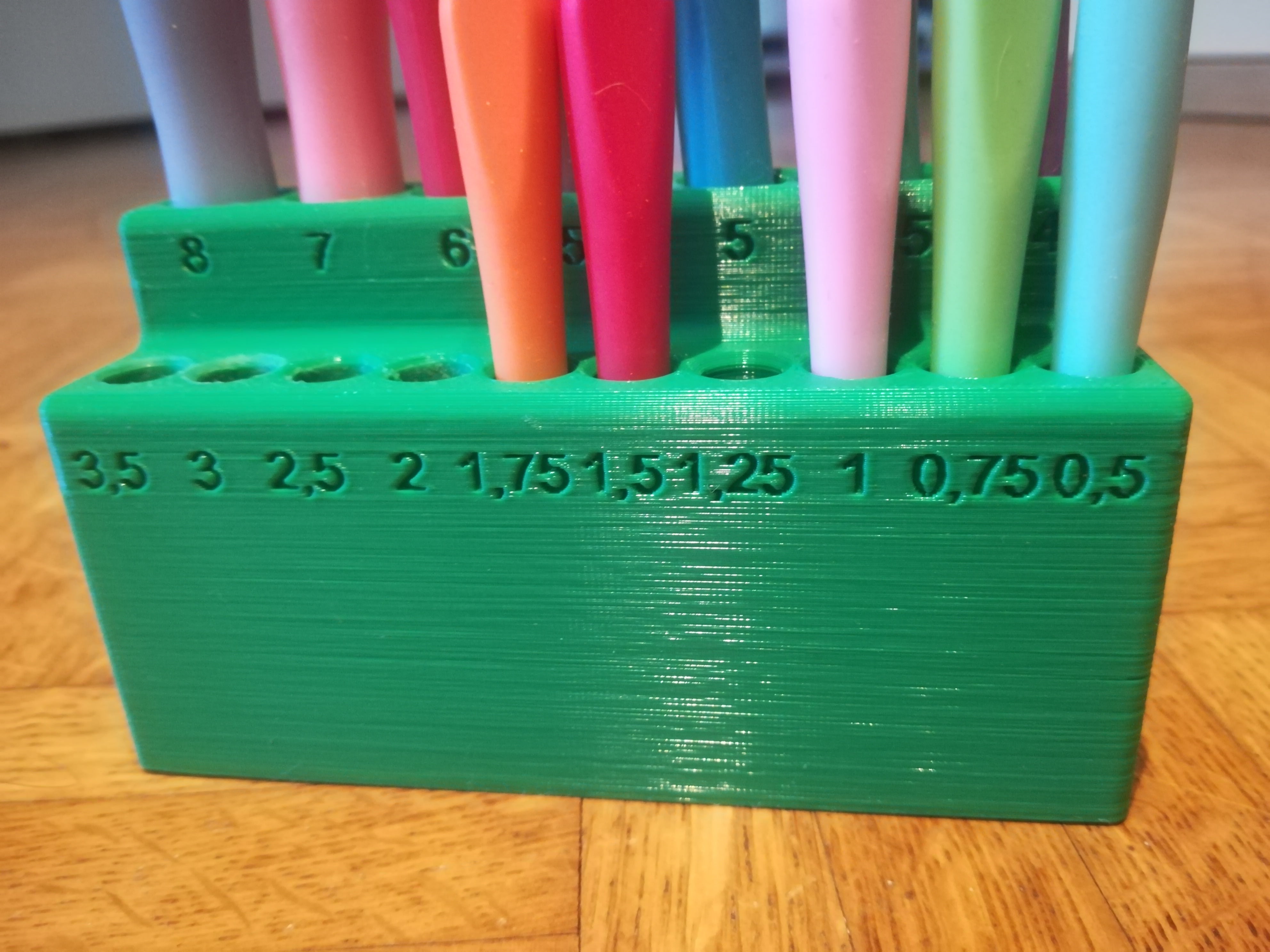 Denna hållare är den perfekta lösningen för att förvara dina favoritvirknålar. Den rymmer 17 olika storlekar av virknålar, vilket gör det enkelt att hålla reda på dina verktyg och snabbt hitta rätt storlek för ditt projekt. Med hålstorlekar från 12 mm till 8 mm anpassar stativet sig till ett brett utbud av virknålar, så att du alltid har dem till hands när inspirationen slår till.