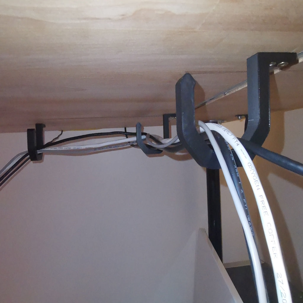 Denna J-krok är utformad för att skapa effektiv kabelhantering under ditt skrivbord . Den är utformad för att hantera flera kabeldragningar och kan enkelt hålla en bunt med upp till 30 CAT-5e nätverkskablar , vilket gör den lämplig för både hemmakontor och andra arbetsstationer. Syftet är att samla och förvara kablar för att minska röran och förbättra estetiken på din arbetsyta. Kroken bidrar till en mer organiserad och säker installation av dina elektroniska enheter. Monteringen sker via försänkta hål dimensionerade för att passa #8 träskruvar, vilket säkerställer en stabil och diskret fastsättning på undersidan av ditt skrivbord. Denna kabelhållare hjälper till att hålla dina kablar organiserade och ger en snyggare och mer funktionell miljö.
