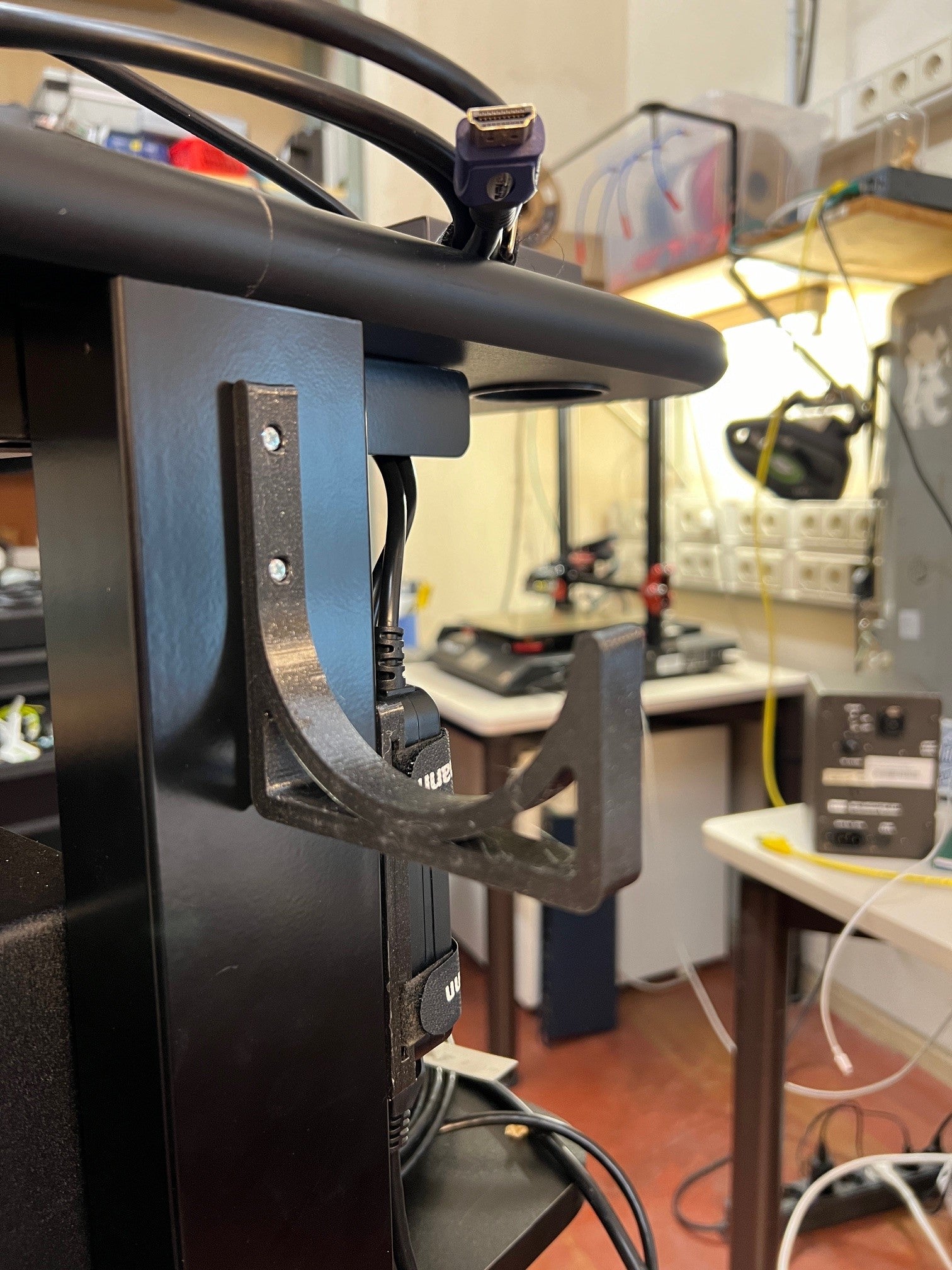 Den är utformad för att bibehålla stabilitet och hålla kablarna på plats även när vagnen är i rörelse. Fästningen är enkel och säker med två M3-skruvar med kulspetspenna, vilket garanterar en tillförlitlig montering. Denna kabelkrok är ett funktionellt element som bidrar till en mer organiserad och effektiv arbetsyta, och håller kablarna snyggt organiserade och inom räckhåll.