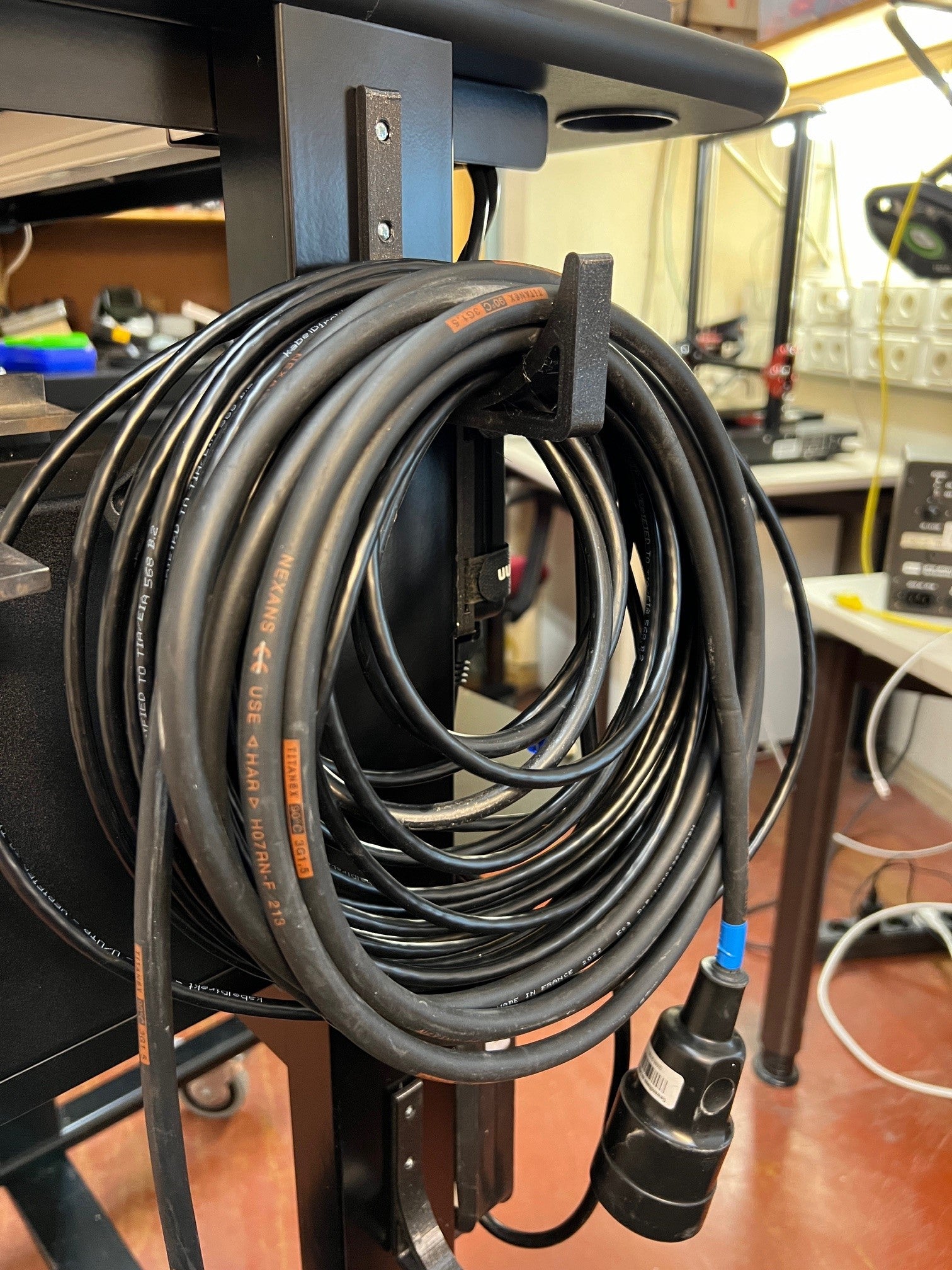 Denna robusta kabelhållare är utformad för att ge en praktisk och säker lösning för kabelorganisering, särskilt på rullvagnar. Med måtten cirka 90x90 mm erbjuder den gott om plats för att hålla reda på olika kabeltyper som XLR- och elkablar, vilket gör den idealisk för användning i studior, workshops eller vid evenemang.