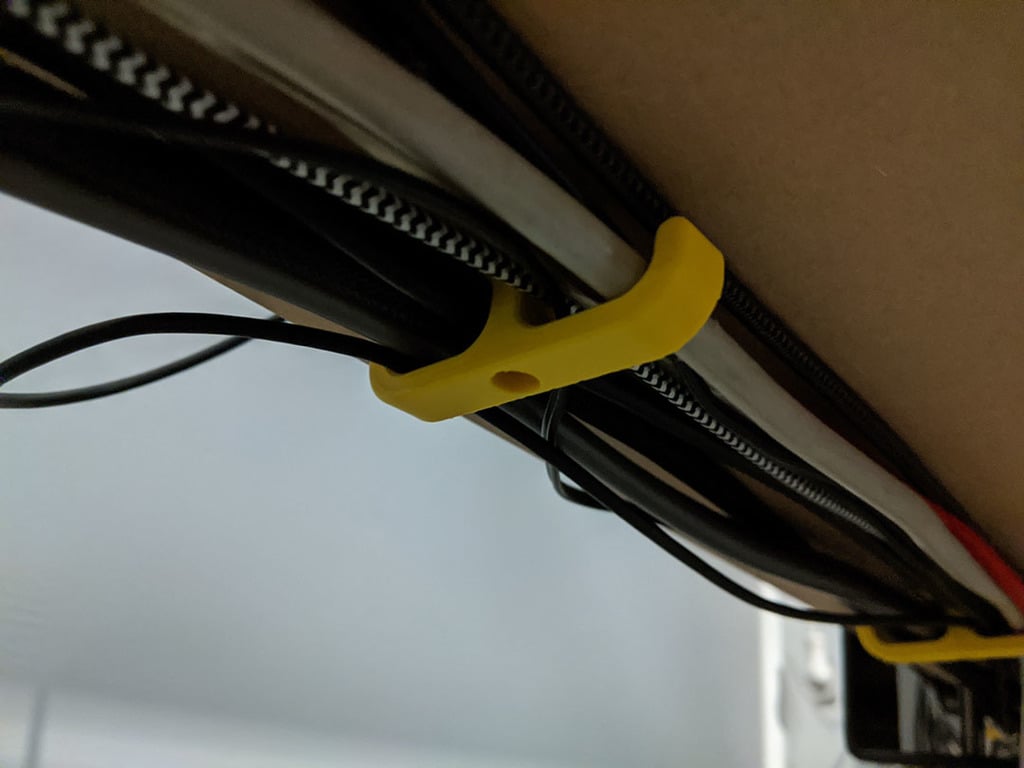 Denna enkla kabelhållare är utformad för att effektivt organisera kablar under ett skrivbord. Den erbjuder ett diskret och praktiskt sätt att hålla ihop kablar, vilket hjälper till att minska röran och bidra till en mer organiserad arbetsyta. Genom att säkra kablar under skrivbordet säkerställer den ett snyggt utseende.