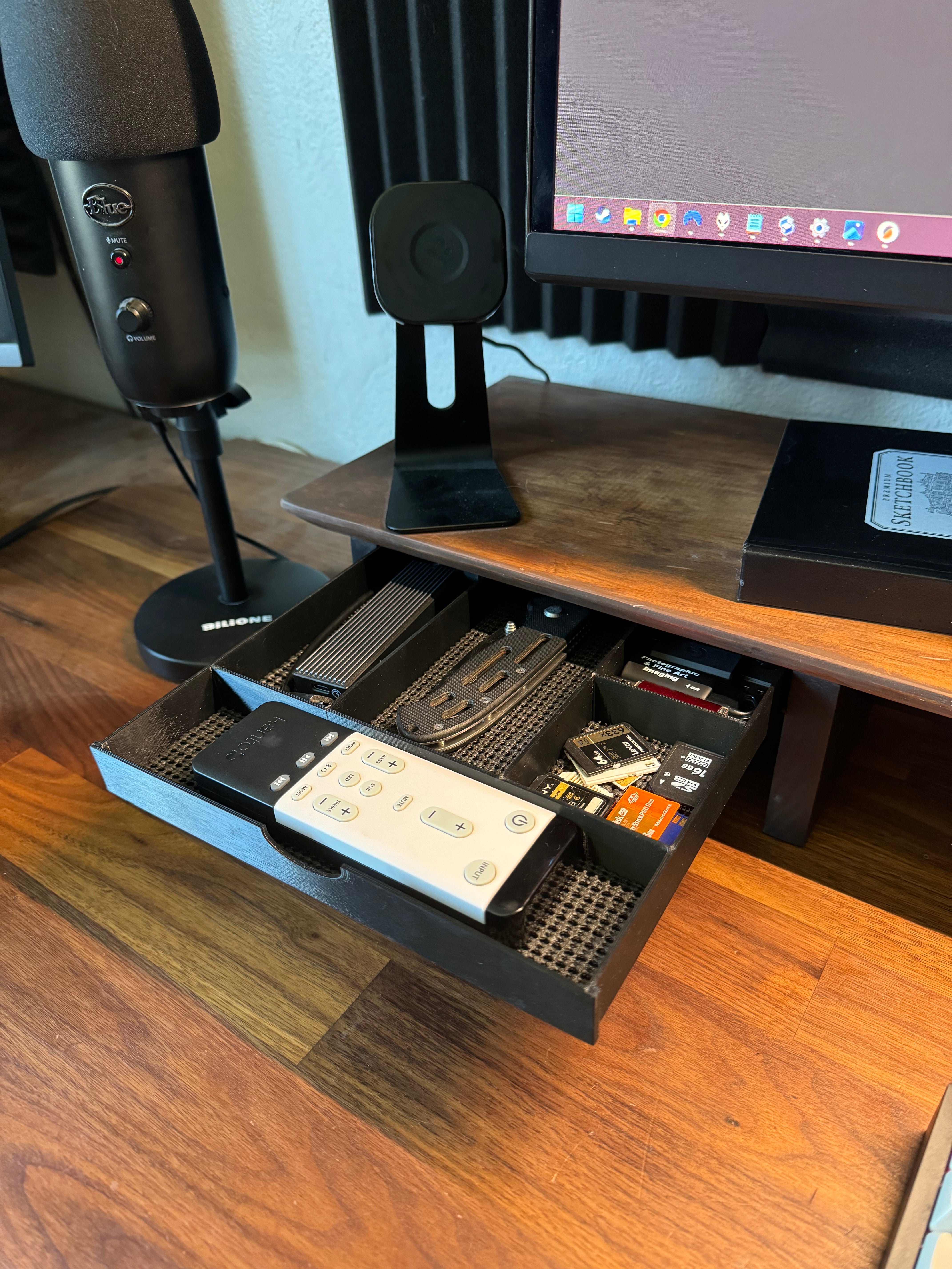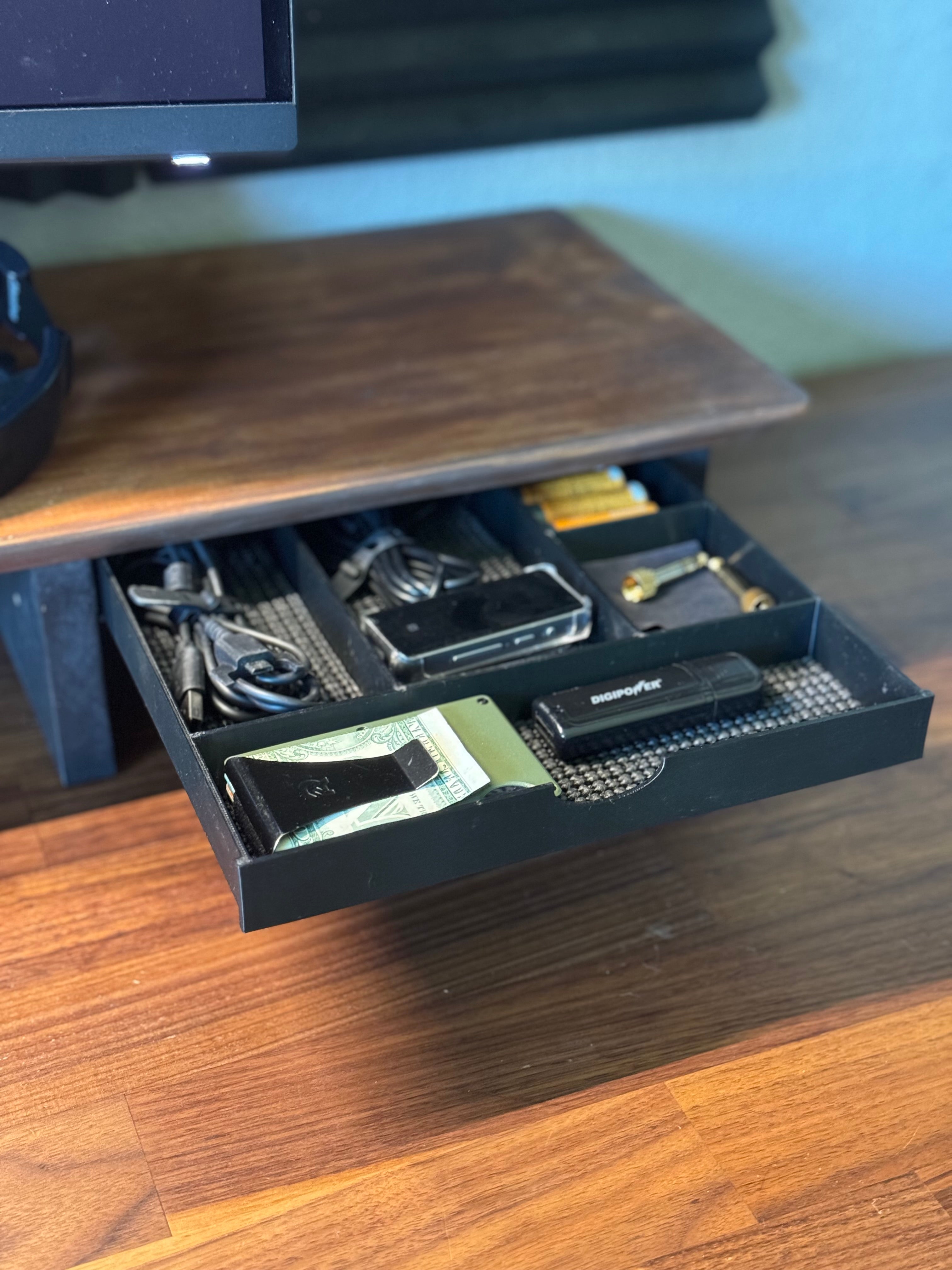 Oavsett om du behöver plats för kontorsmaterial, elektronik eller bara vill ha en mer organiserad arbetsyta, kommer denna skrivbordshylla med lådor att förvandla ditt skrivbord till en mer effektiv och städad miljö.