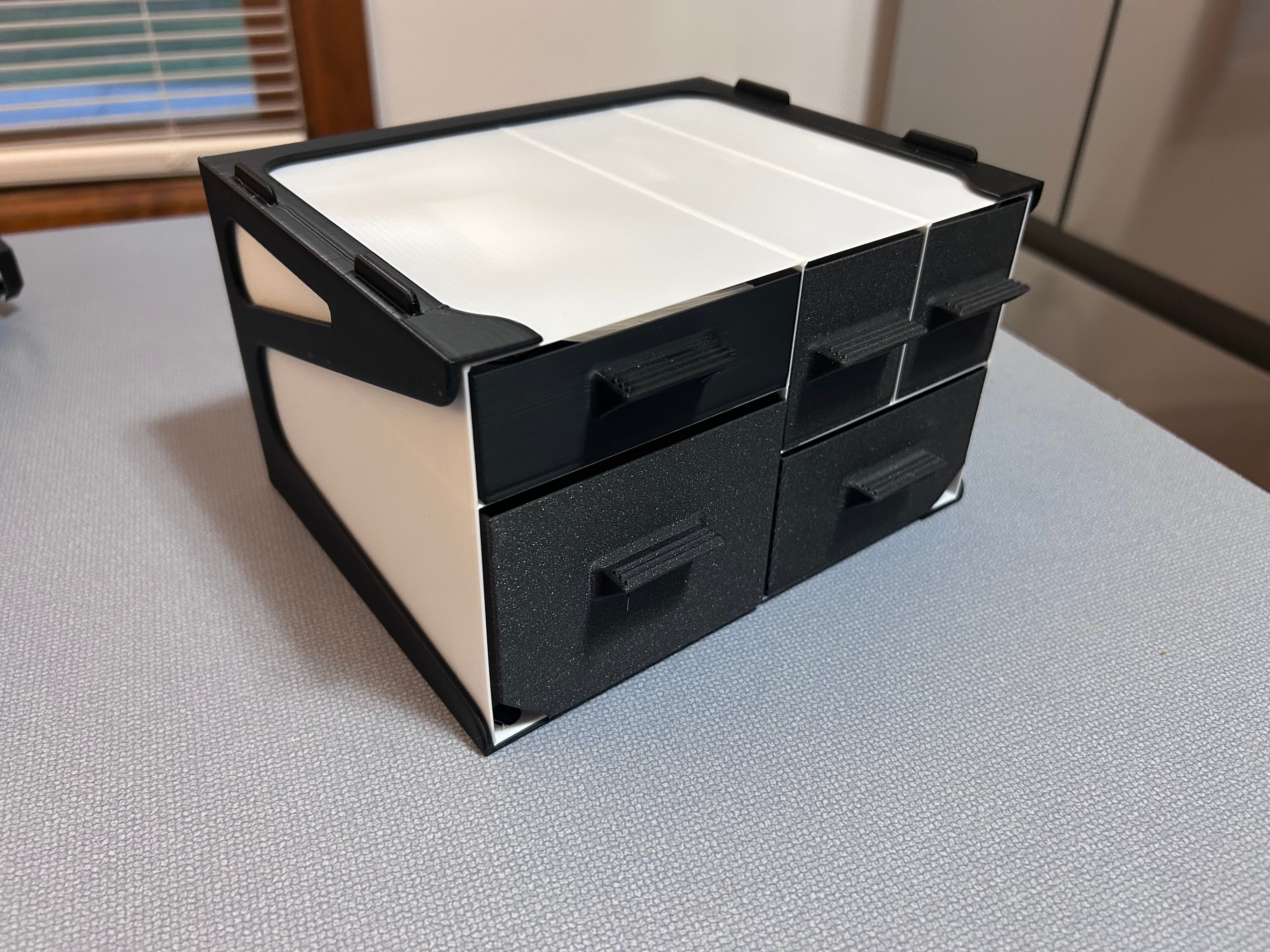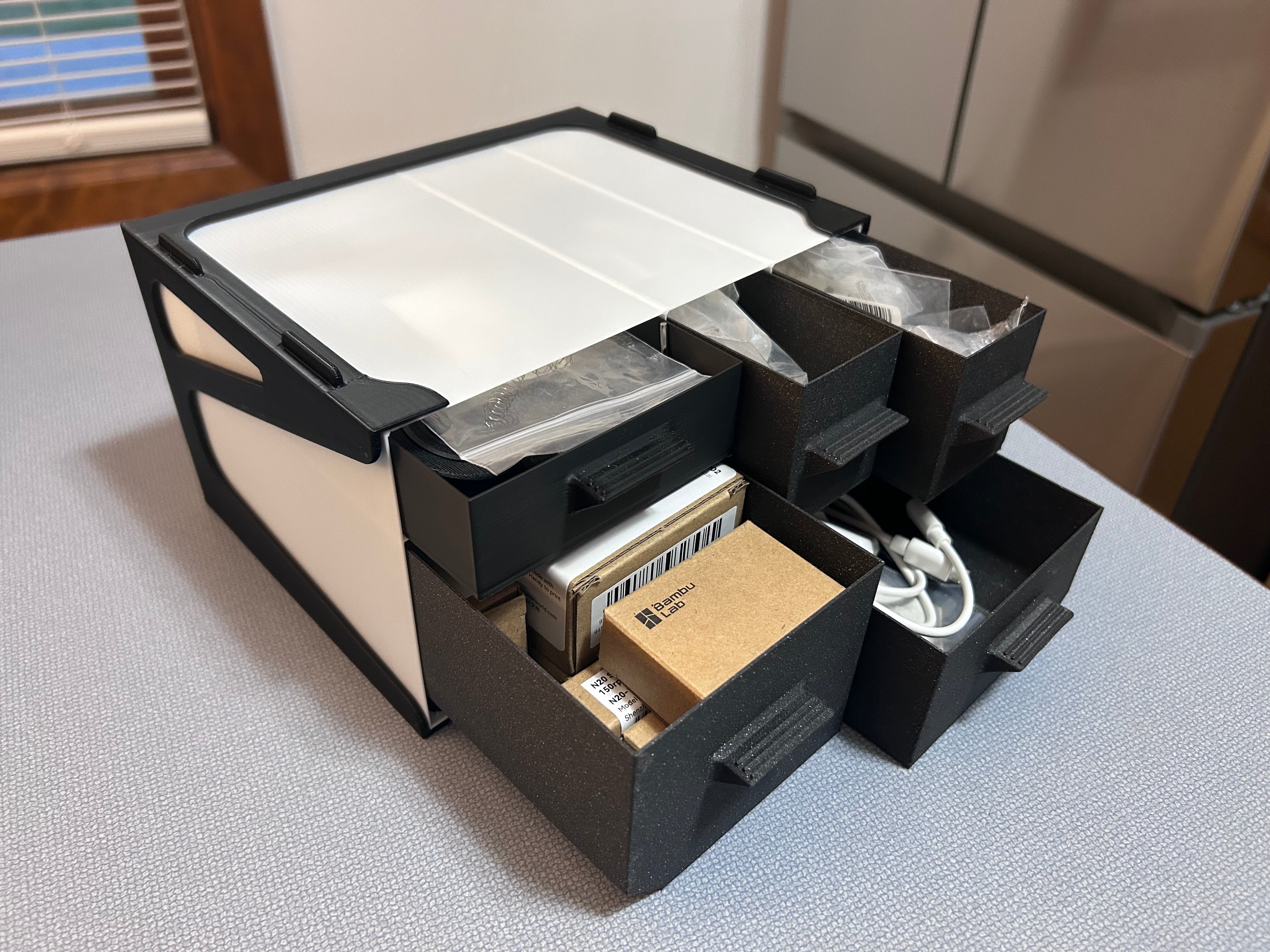 Med den innovativa designen kan du välja att använda lådorna eller ha dem öppna, beroende på dina förvaringsbehov. Systemet kräver inget stöd, vilket säkerställer enkel installation och praktisk användning. Den kan enkelt placeras på en av hyllorna och ger både stil och ordning till ditt utrymme.