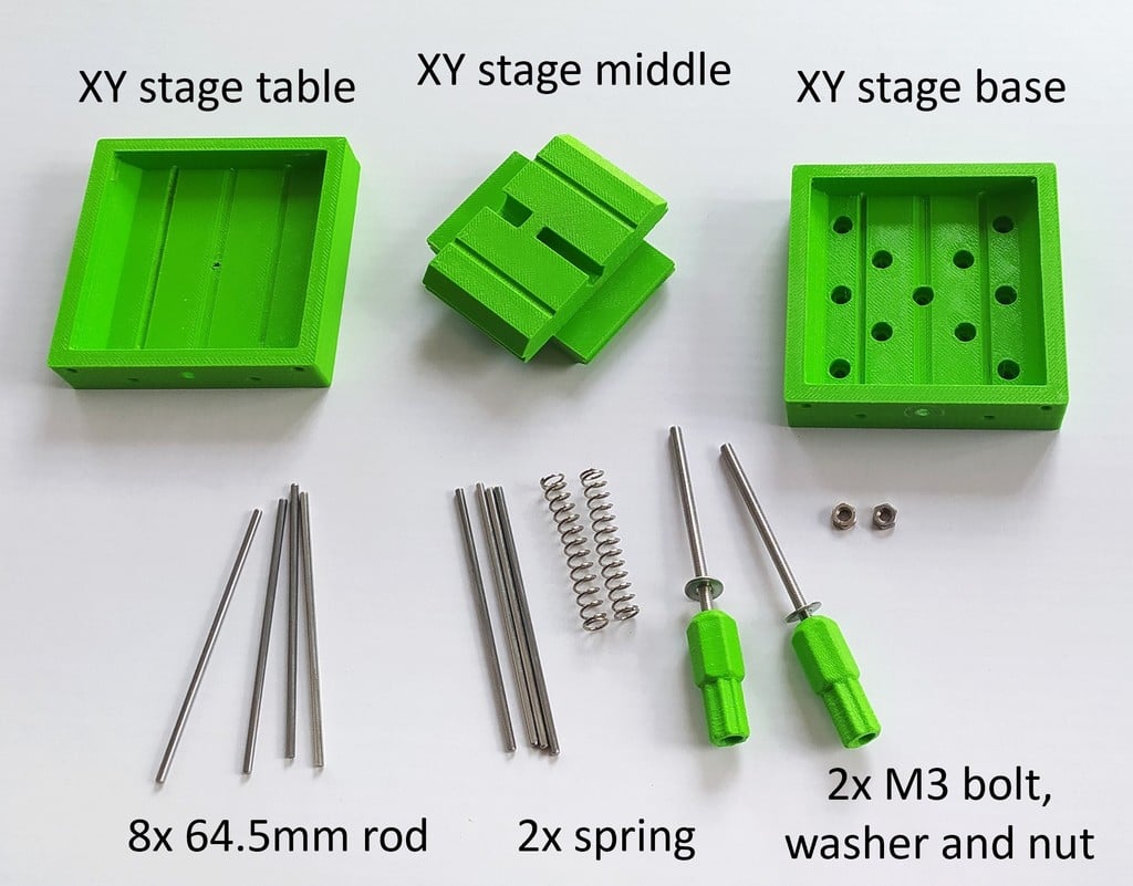 Tvåaxliga tryckta linjära steg ger en imponerande positioneringsnoggrannhet på cirka 10 mikrometer. Denna robusta struktur, som kombinerar 3D-printade delar med 2 mm metallstänger och två fjädrar, framhäver en effektiv design som kan användas i olika precisionsprojekt.